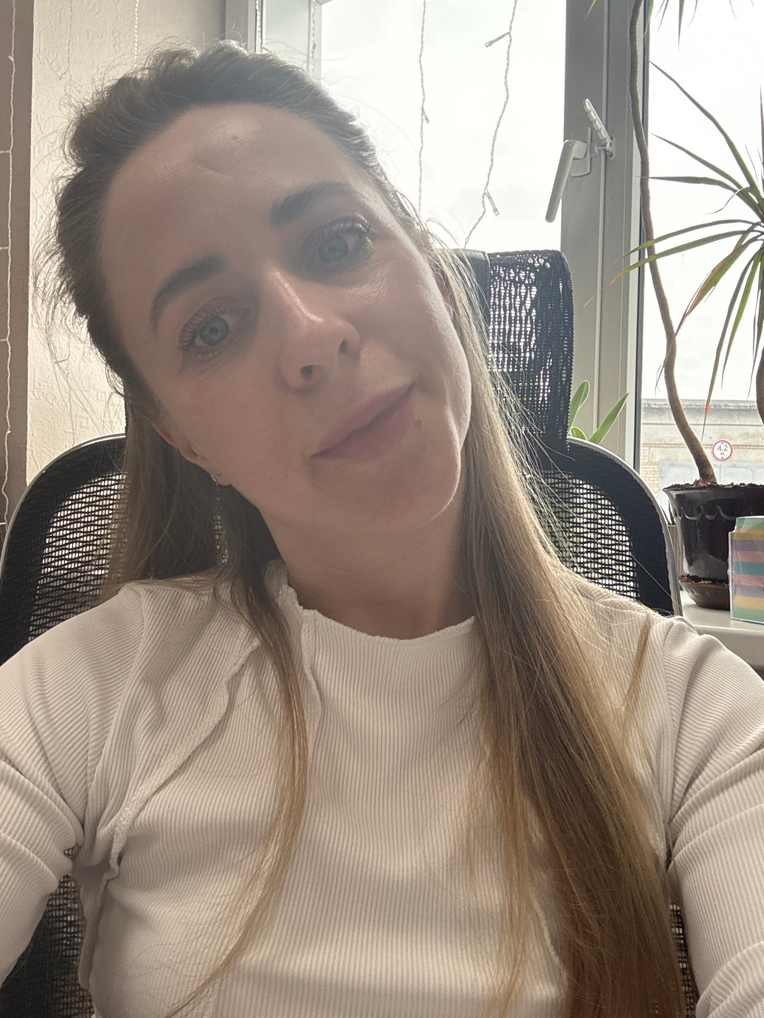 A woman with light brown hair and blue eyes is sitting in a black mesh office chair. She is wearing a white ribbed top. Behind her is a window with a plant and a view of a building. The location is po…read more