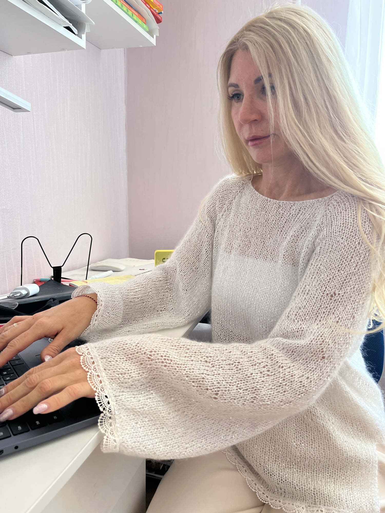 A woman with long blonde hair is seated at a desk, leaning over a laptop. She is wearing a light-colored, loosely knit sweater with lace trim on the sleeves. Her hands are on the keyboard. In the back…read more