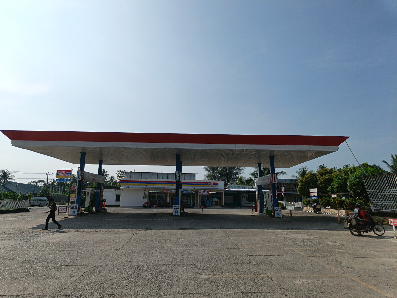 A wide-angle shot shows a gas station in Keudeteupinpunti, Indonesia, under a clear, bright sky. The prominent red-roofed gas station canopy dominates the frame. A person is walking towards the left sā¦read more