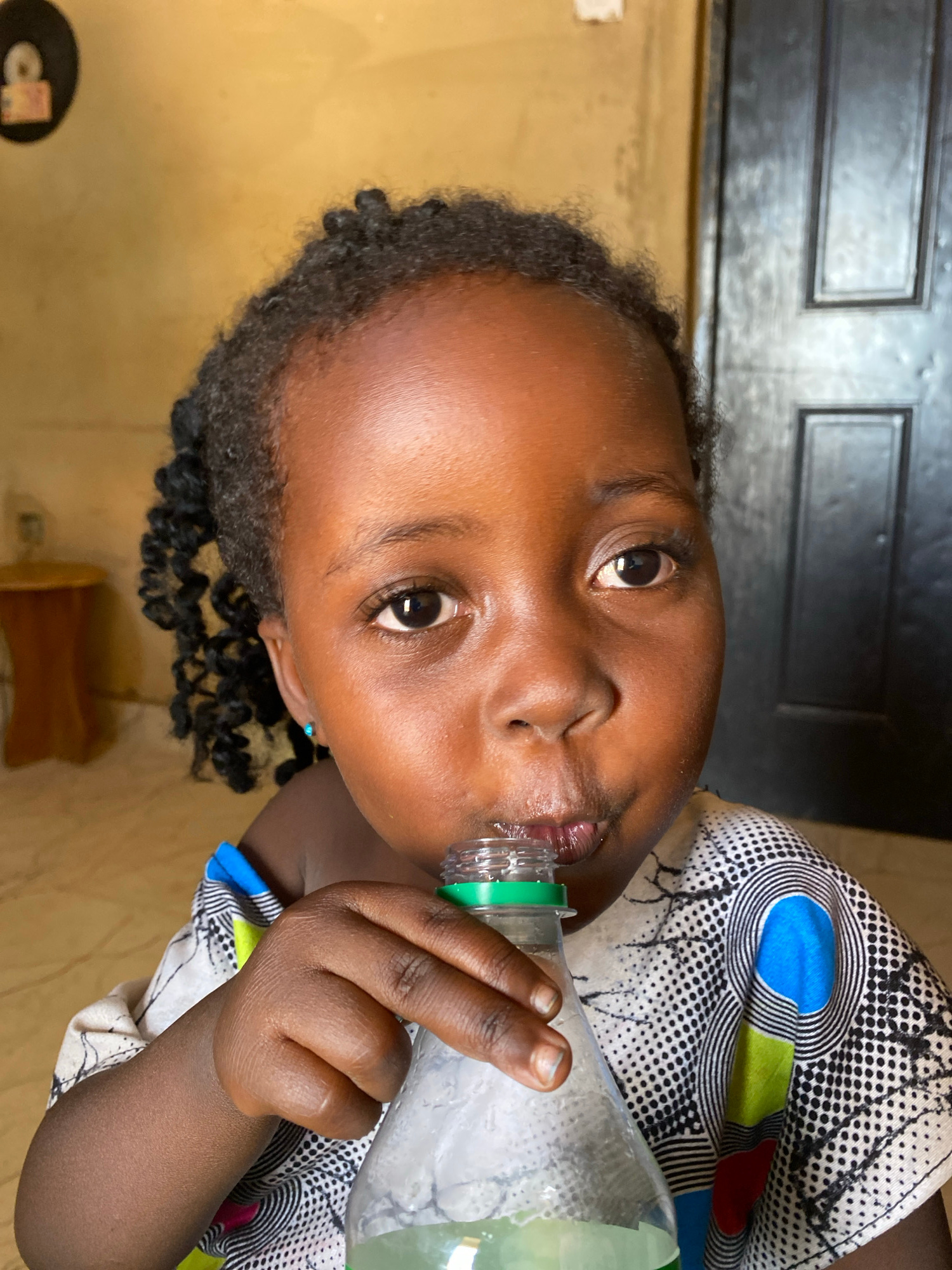 This close-up, portrait-oriented image captures a young girl drinking from a plastic bottle in an indoor setting. The girl has dark skin, wide, expressive dark eyes, and dark, curly hair styled in sma…read more