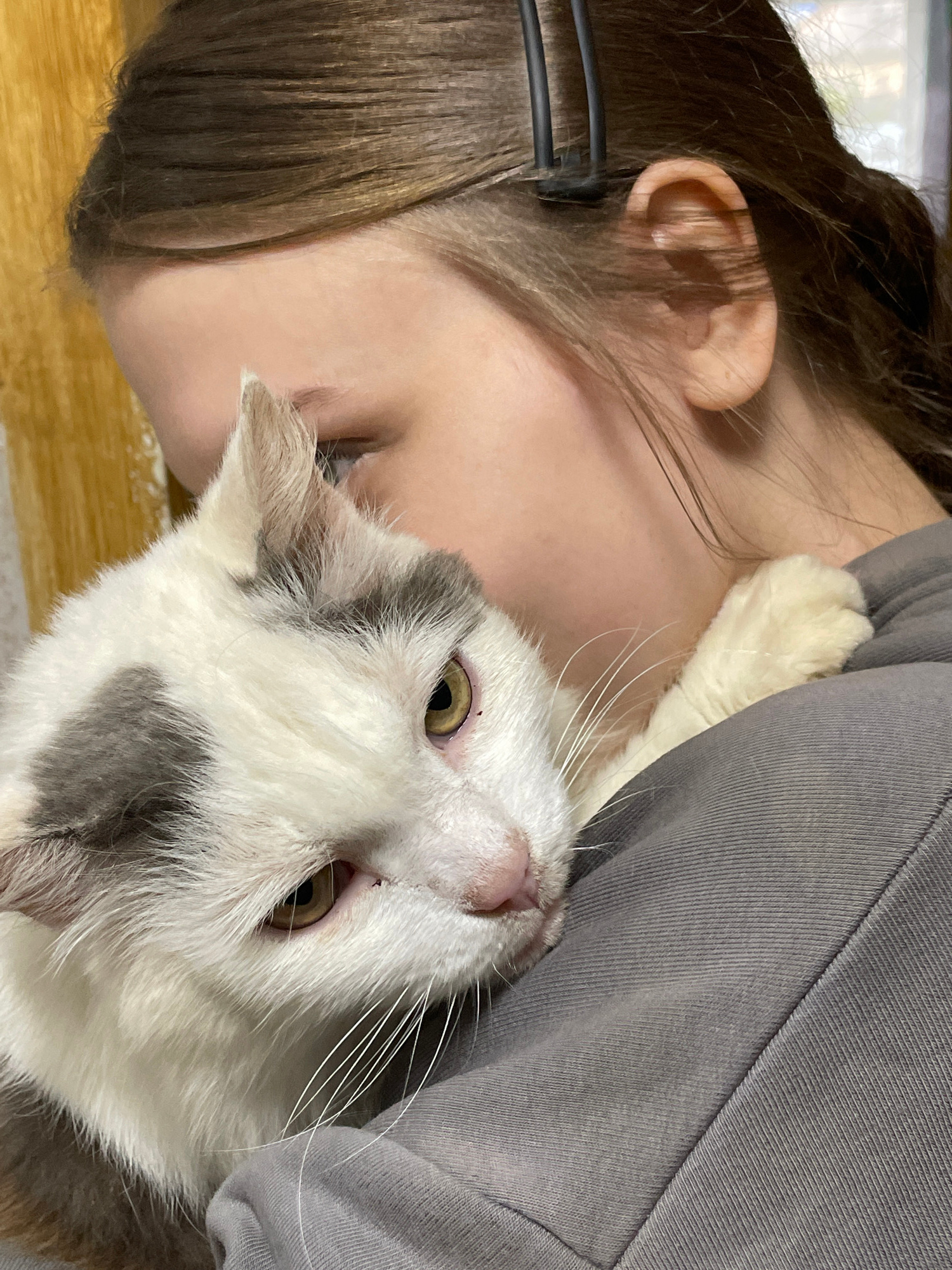 A close-up, diagonal shot captures an intimate moment between a person and a cat in an indoor setting. The left side of the frame features the profile of a young person, showcasing their brown hair, e…read more