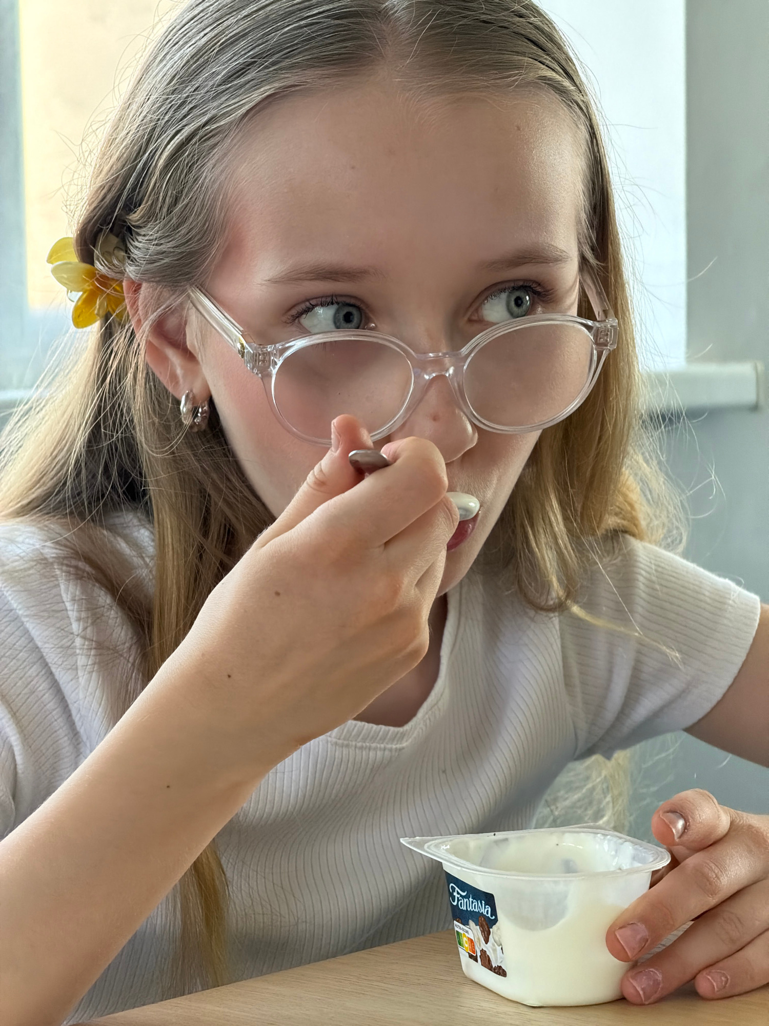 A young person with fair skin, light blonde hair, and blue eyes is holding a spoon and a container of "Fantasia" brand yogurt. The person is wearing clear-framed glasses, a light-colored ribbed shirt,…read more