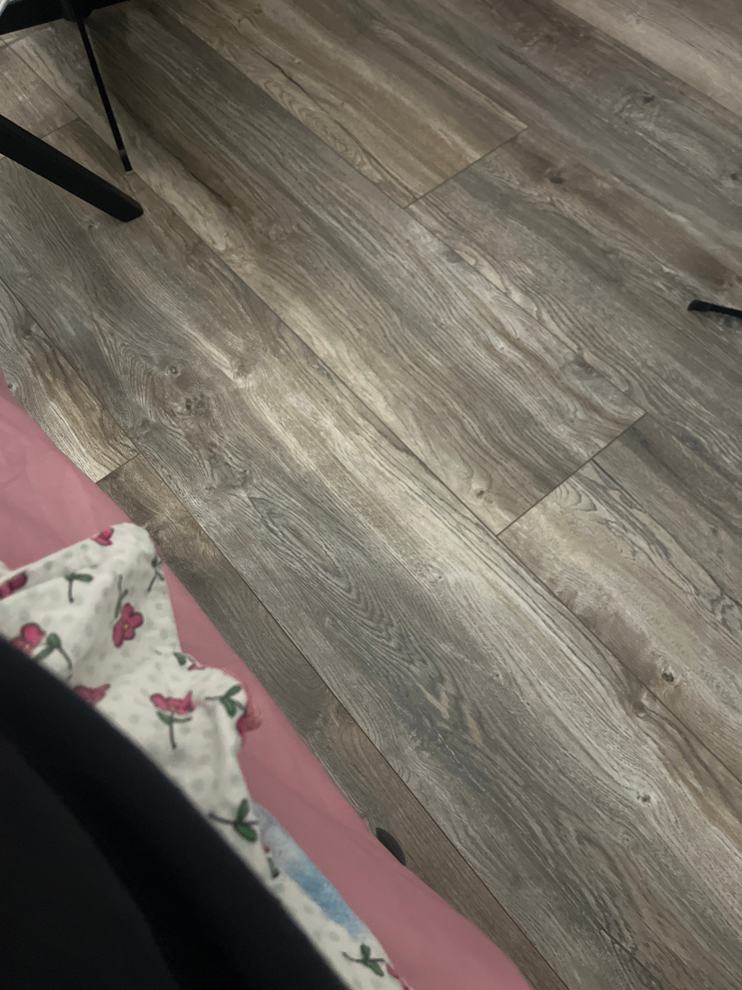 The image shows a section of a room with wood-look flooring. Part of a pink surface is visible in the lower right, overlaid with a piece of floral-patterned fabric. A black object, possibly clothing,…read more