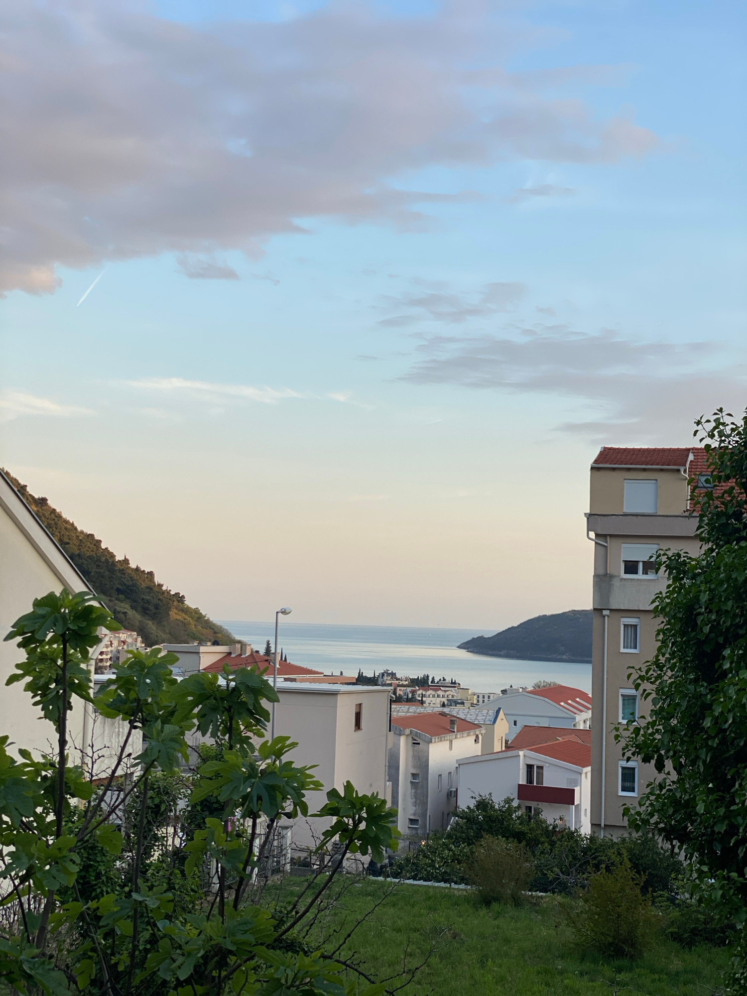 The image depicts a view of Budva, Montenegro, from an elevated position. The sky is visible with a mix of clear blue and cloud cover. In the distance, a mountain or large hill can be seen across the…read more