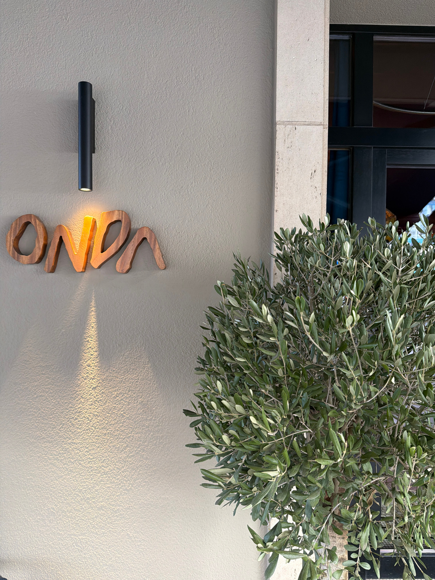 The image displays the exterior of a commercial establishment in Luxembourg City, Luxembourg. On the left, a light-beige textured wall features the word "ONDA" rendered in carved, irregularly shaped w…read more