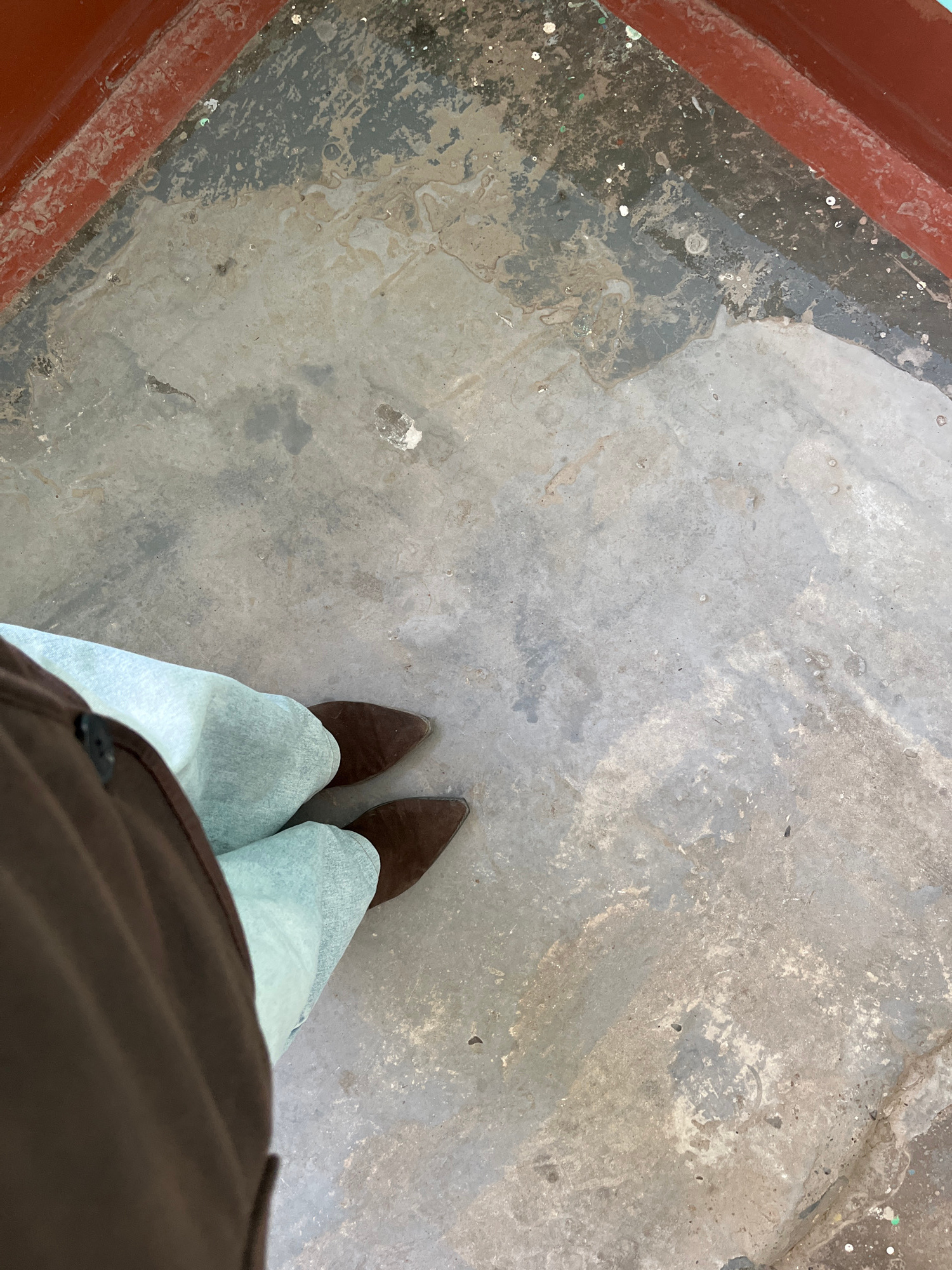 A high-angle shot depicts a person standing on a worn, gray concrete surface. The person is wearing light-colored denim jeans and brown, suede-like pointed-toe boots. A portion of a brown garment, pos…read more
