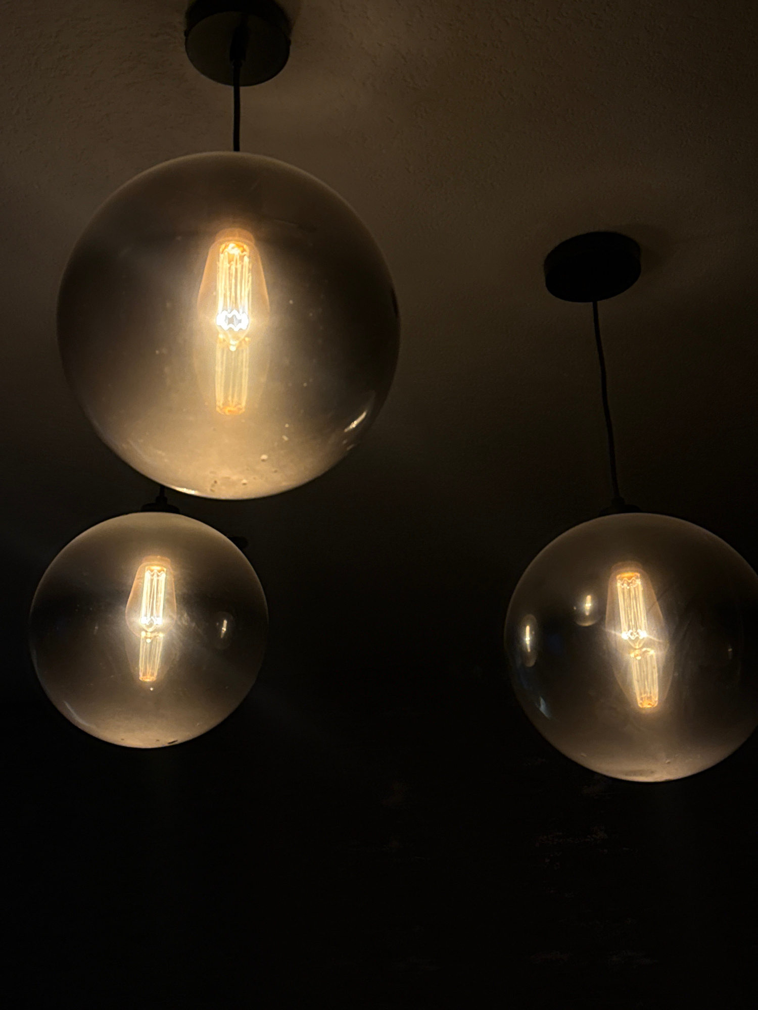 The image shows a low-angle view of three spherical light fixtures attached to a wall. Each fixture consists of a black circular mount, a short arm extending from the mount, and a spherical glass shad…read more