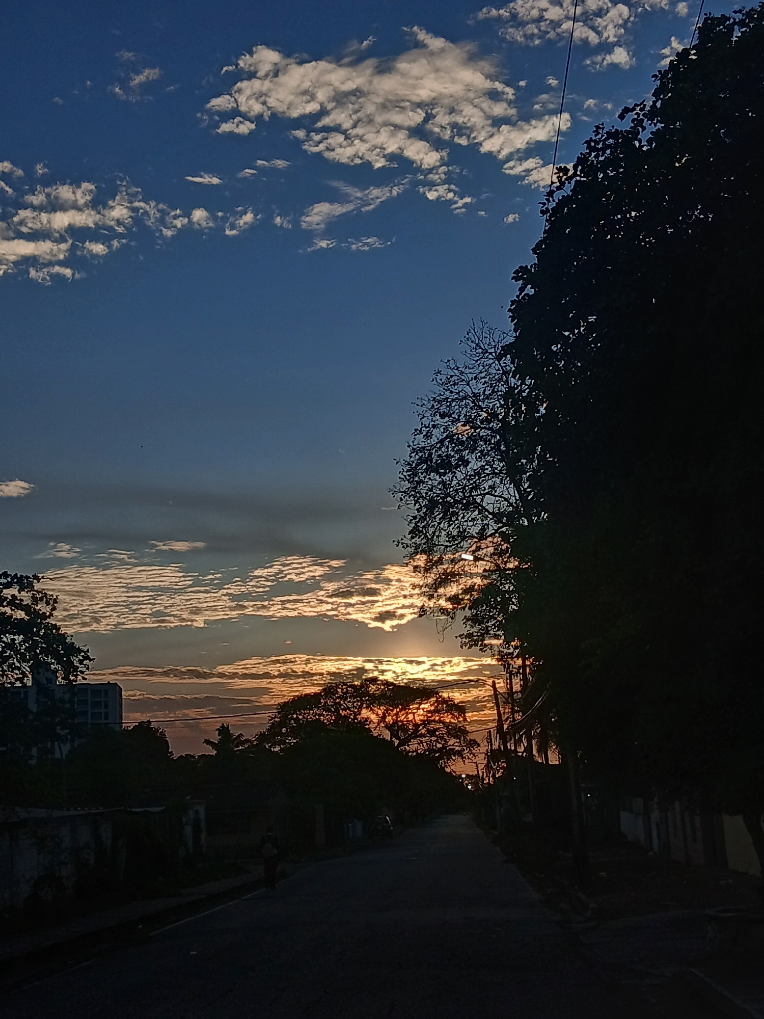 The image depicts a sunset scene along a street in what is presumed to be Juan Griego, Venezuela. The sky is a gradient of blue to orange and gold, filled with elongated, striated clouds illuminated b…read more