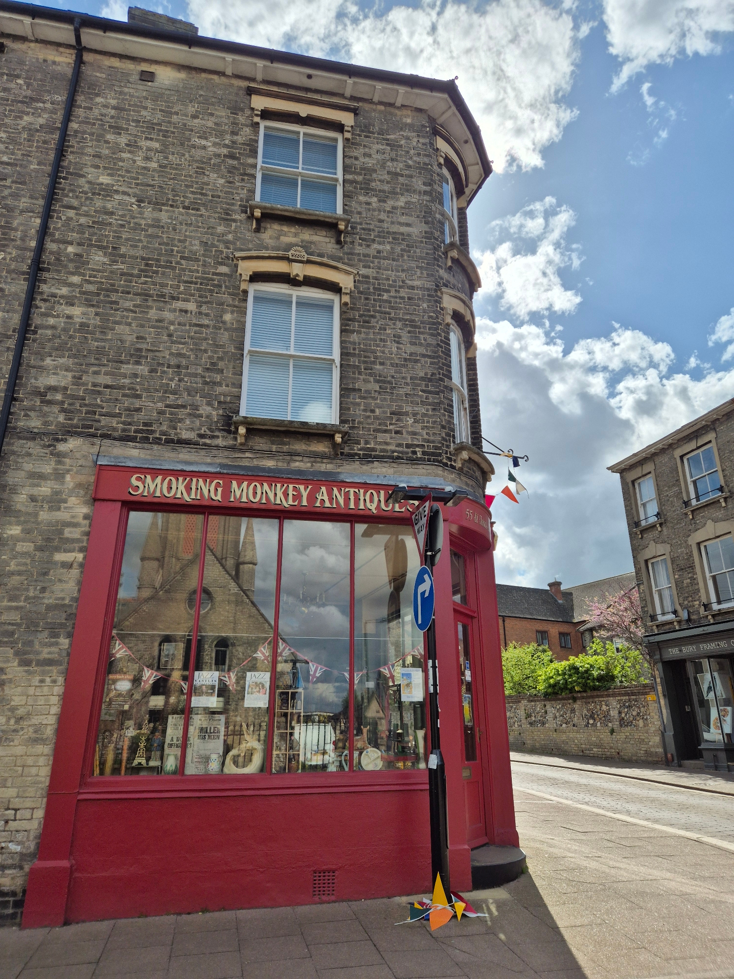 The image shows the exterior of "Smoking Monkey Antiques" shop, located in West Suffolk, United Kingdom. The shop, painted red, has large windows displaying various items for sale and reflects the ima…read more