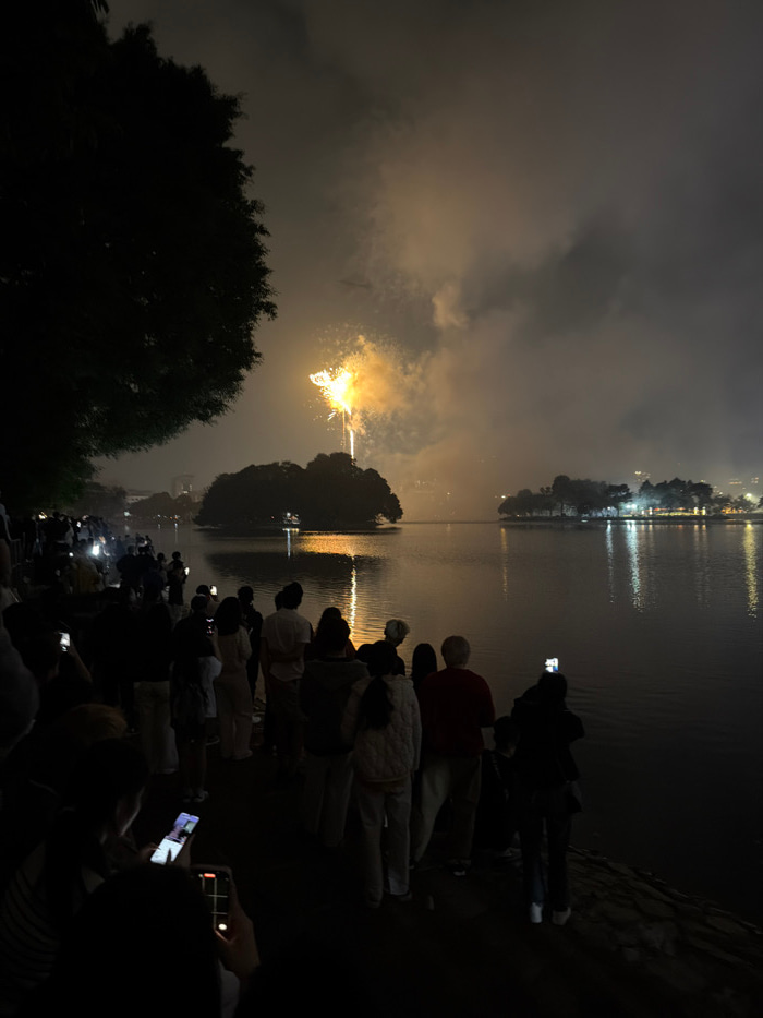 A crowd stands on the edge of a body of water, many holding phones and recording. Fireworks explode in the sky above an island, their light reflected in the water. The sky is cloudy and dark, illumina…read more