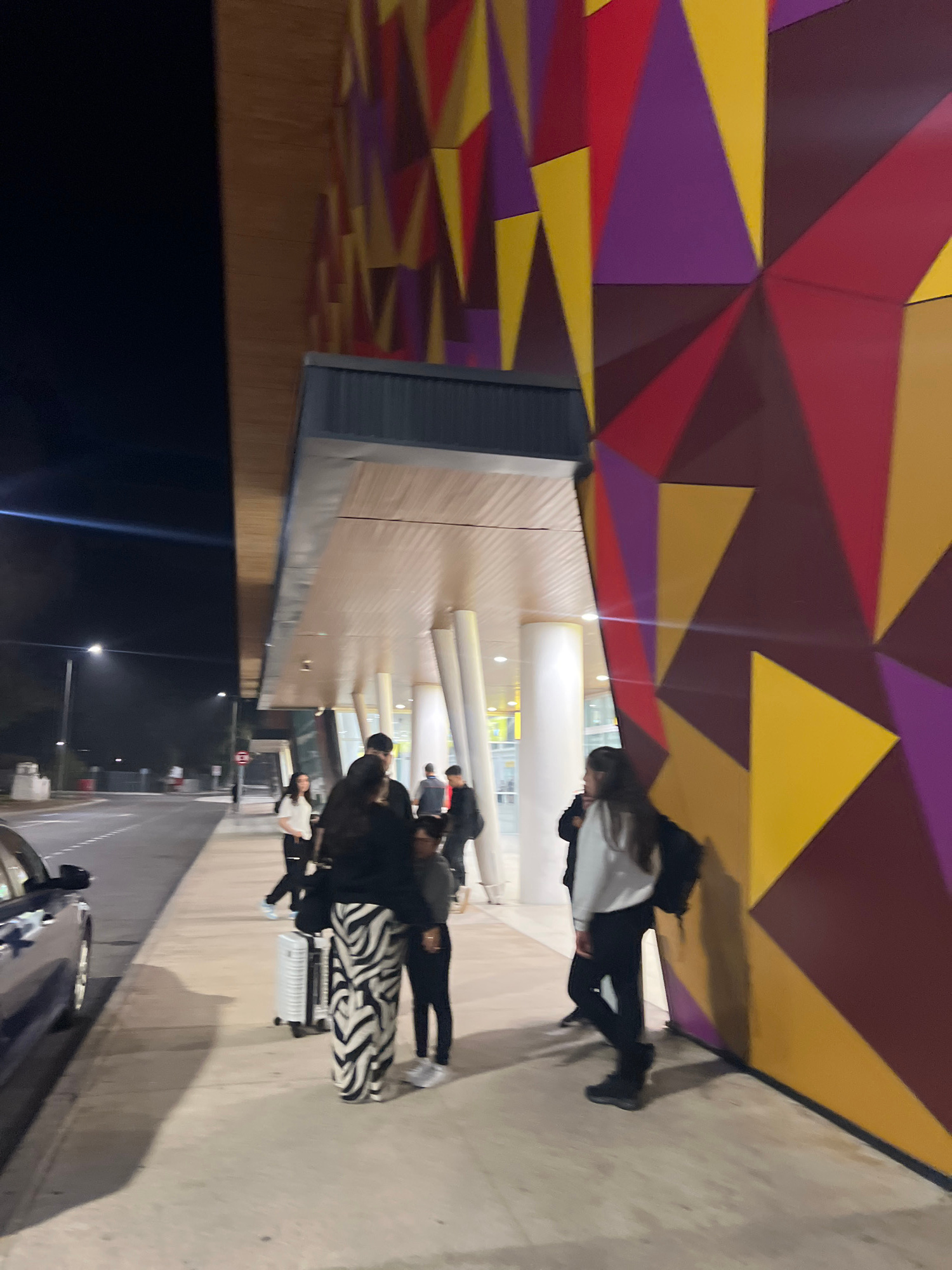 The image depicts a group of people with luggage outside a building with a brightly colored geometric facade. The wall features triangles in shades of yellow, purple, and red. Several people are walkiβ¦read more