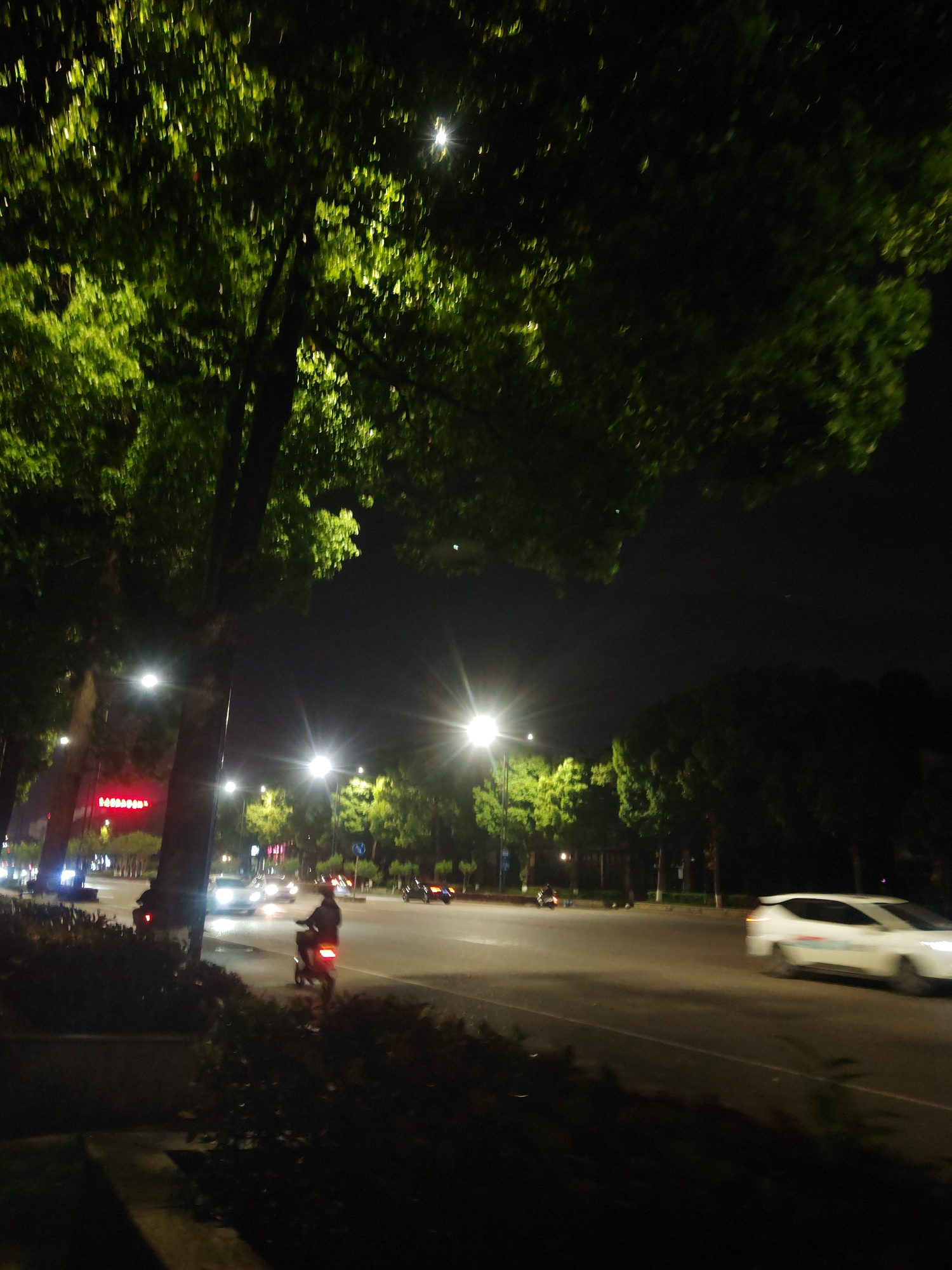 This image captures a night scene in Chongqing High-tech Zone, China. The view is from an elevated position, looking down onto a multi-lane road illuminated by streetlights. A line of trees separates…read more