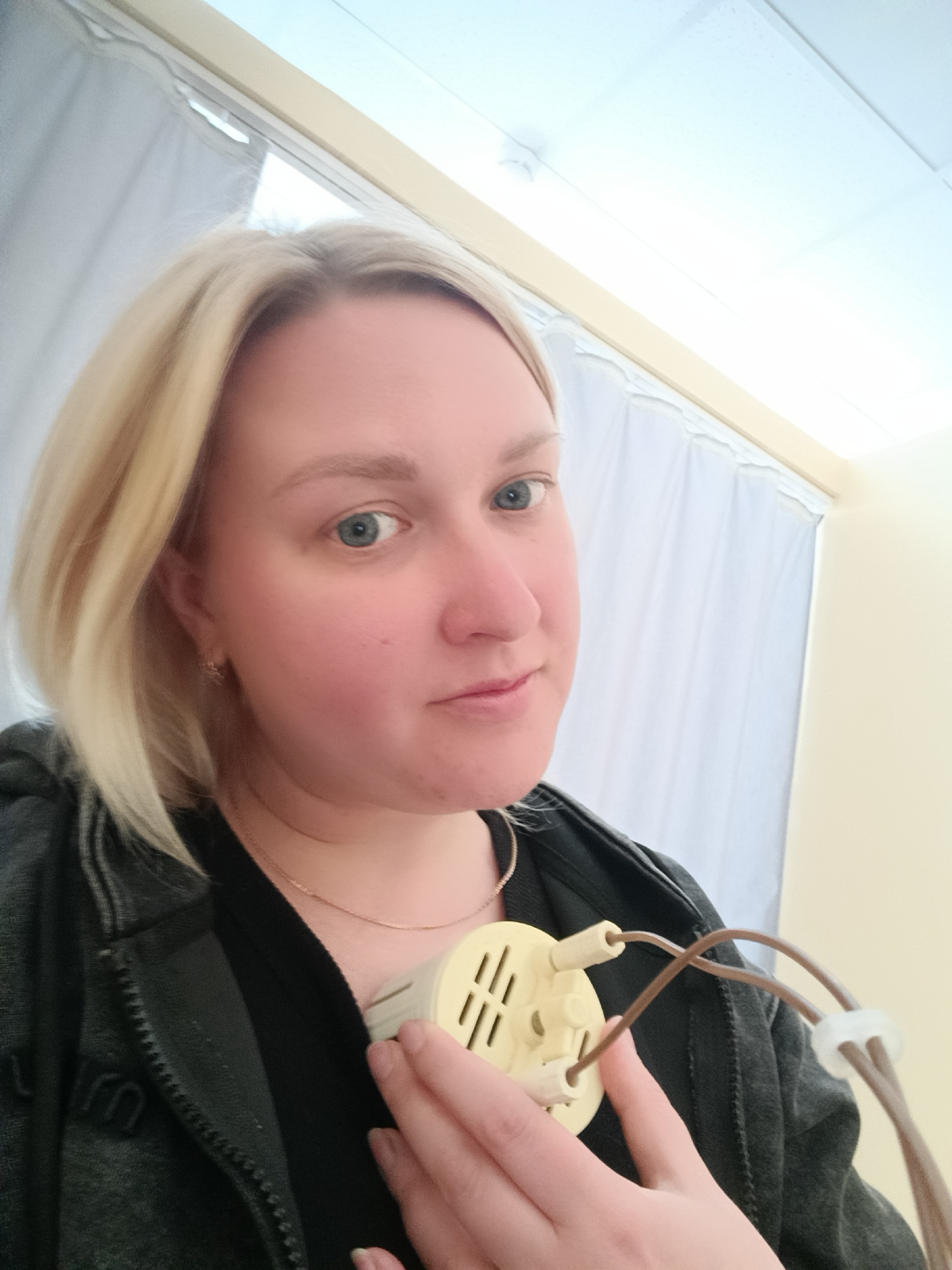 A fair-skinned woman with blonde hair is holding a beige electronic device against her chest. She is wearing a dark zip-up jacket and a gold necklace. Behind her are white curtains and a light-colored…read more
