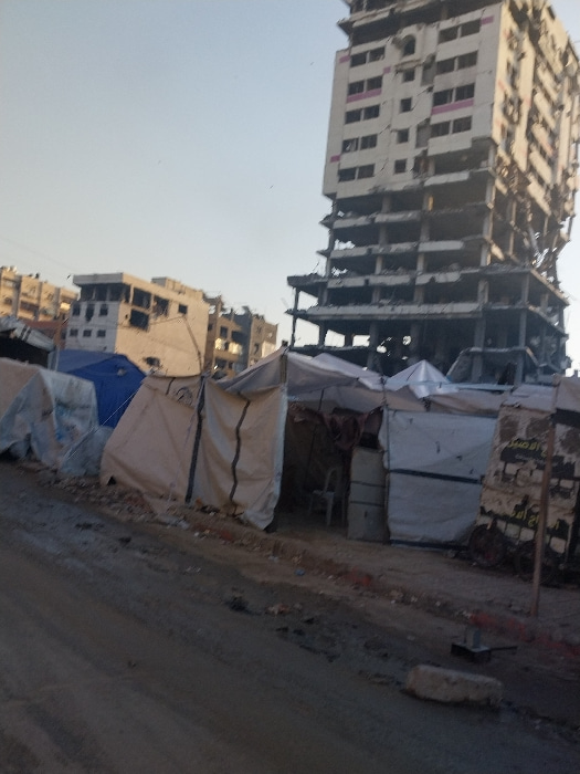 The image captures a scene of urban devastation and displacement in Gaza, Palestinian Territory. The setting is an area characterized by significant structural damage and the presence of makeshift sheβ¦read more