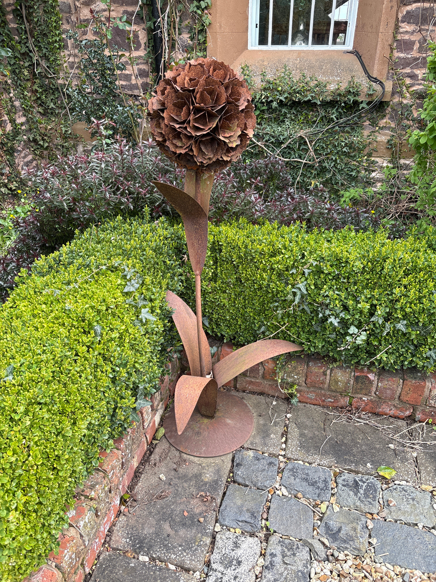 The image captures a garden scene in Pulverbatch, United Kingdom. A rusted metal sculpture of a flower and its leaves stands prominently amidst a well-maintained garden. The garden features neatly tri…read more