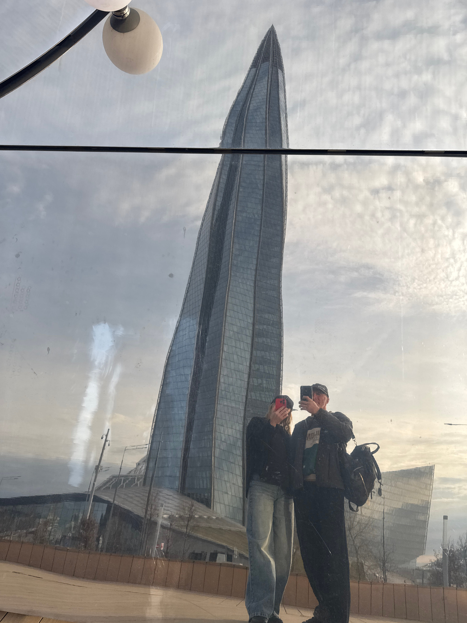 A reflection shows a couple taking pictures in front of the Lakhta Center in Saint Petersburg, Russia. The building's spire dominates the reflection, which also captures an overcast sky and part of th…read more