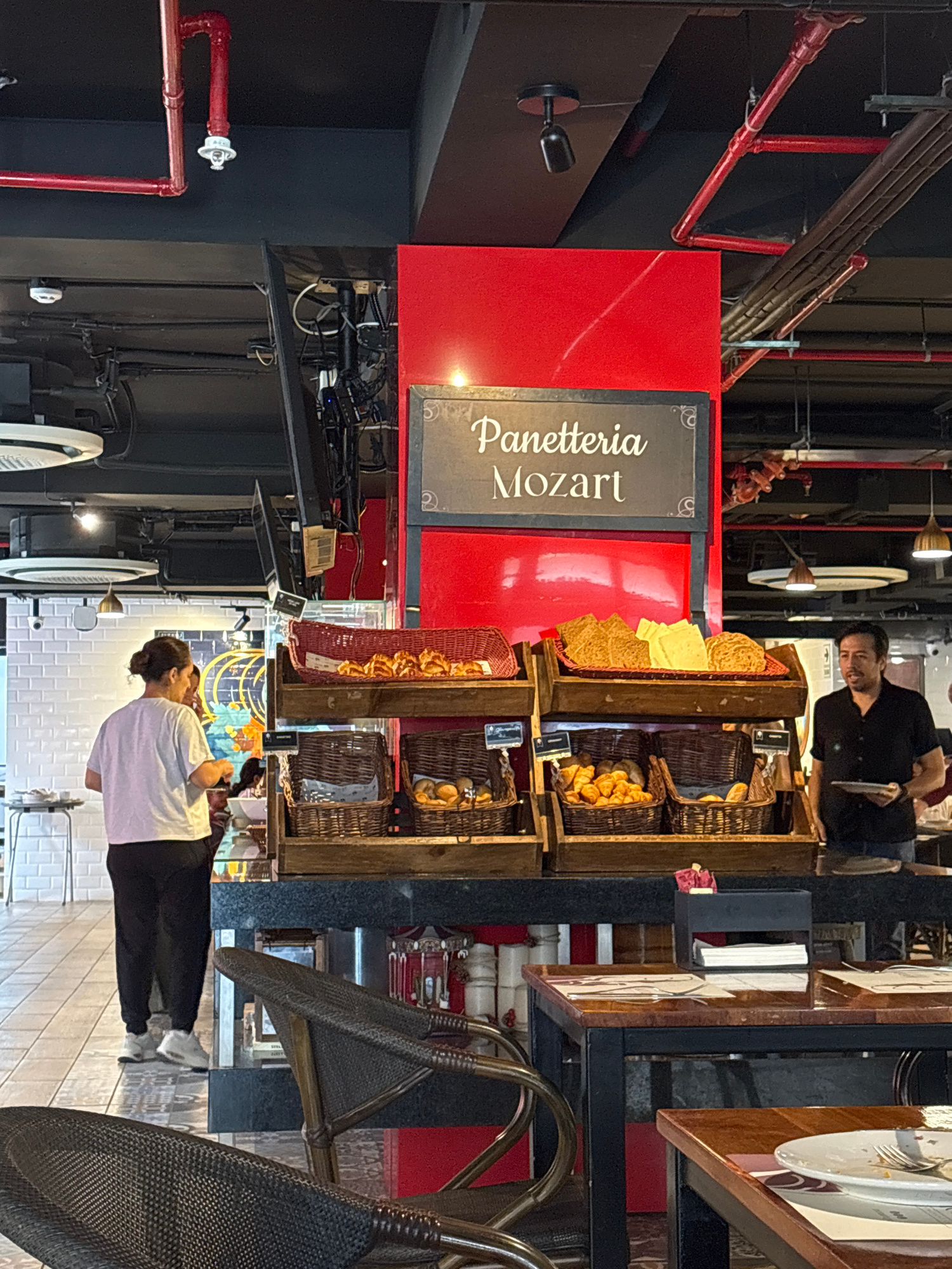 The scene depicts an indoor area, possibly a bakery, in San Isidro, Peru. A sign reading "Panetteria Mozart" is visible, suggesting this is the name of the establishment. Various baked goods are displ…read more