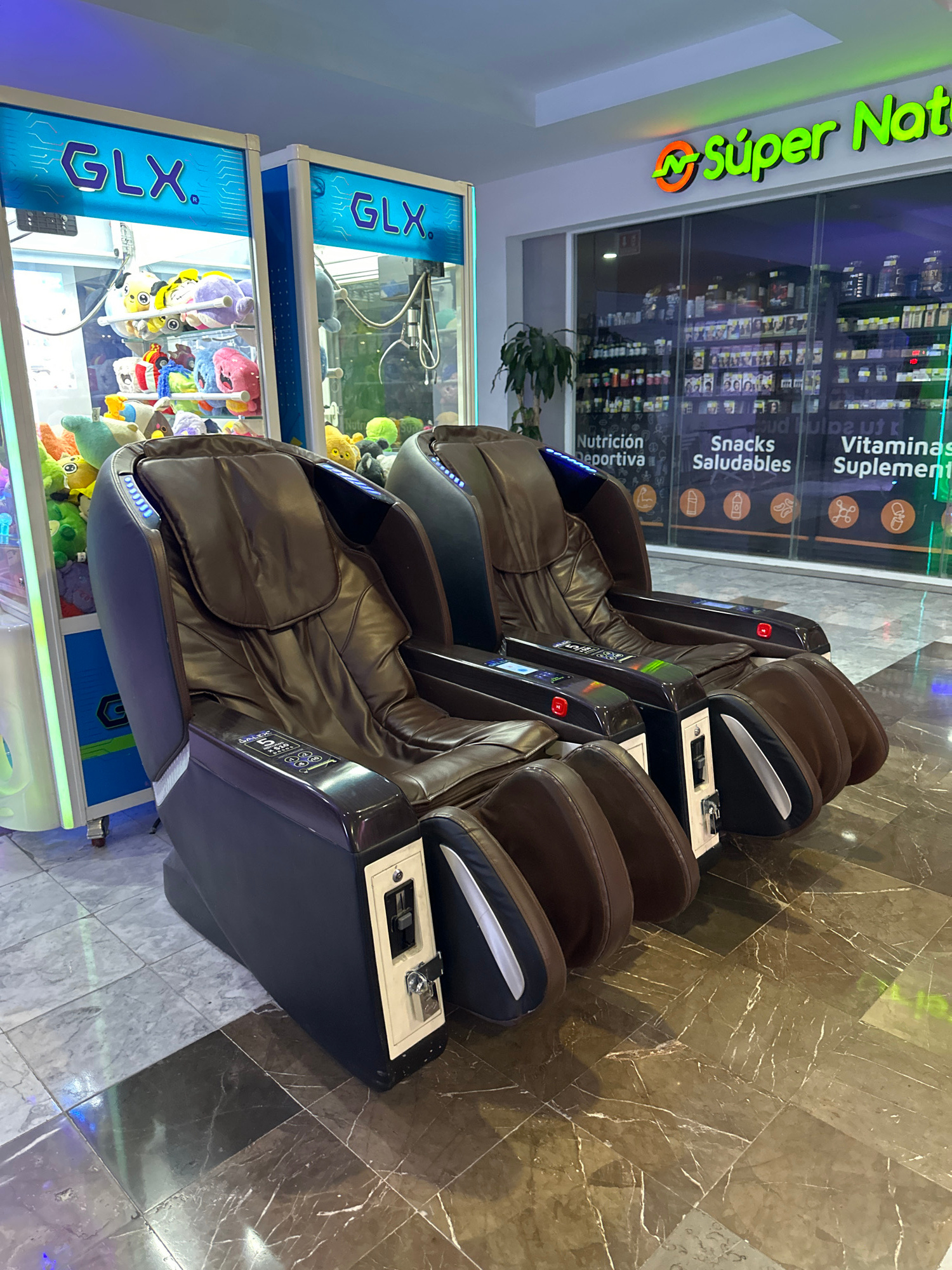 The image depicts a brightly lit indoor setting, likely a shopping mall in Huixquilucan de Degollado, Mexico. Three identical massage chairs are arranged in a row, angled toward the right. The chairs…read more