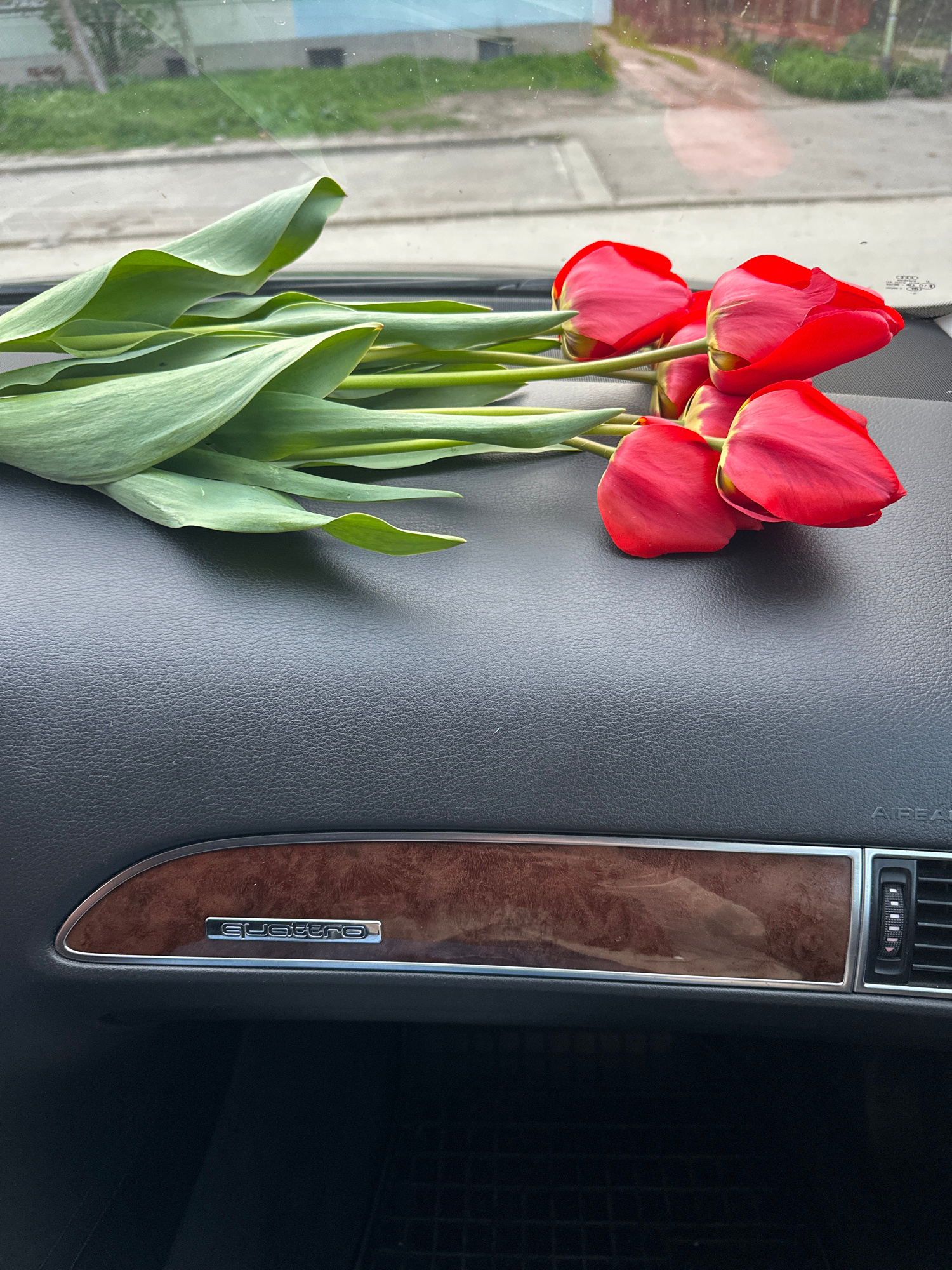 The image shows a bouquet of red tulips lying on the dashboard of a car. The dashboard is black leather with a wood-grain panel on the right side, which also has a "Quattro" emblem. Outside the car wi…read more