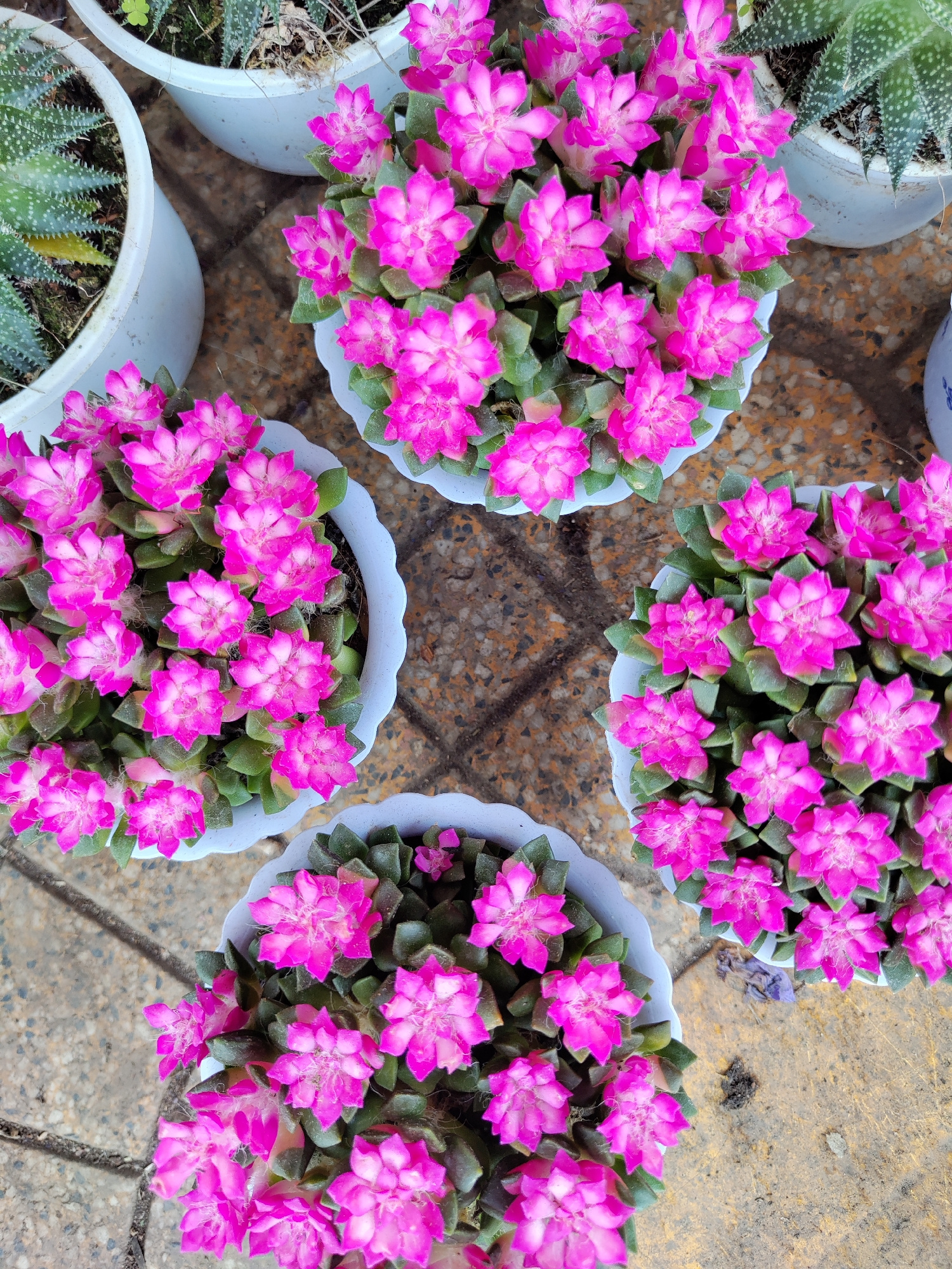 The image shows a collection of potted plants, primarily featuring succulents with vibrant pink flowers. There are five pots visible, arranged in a loose cluster on a textured, possibly tiled, surface…read more