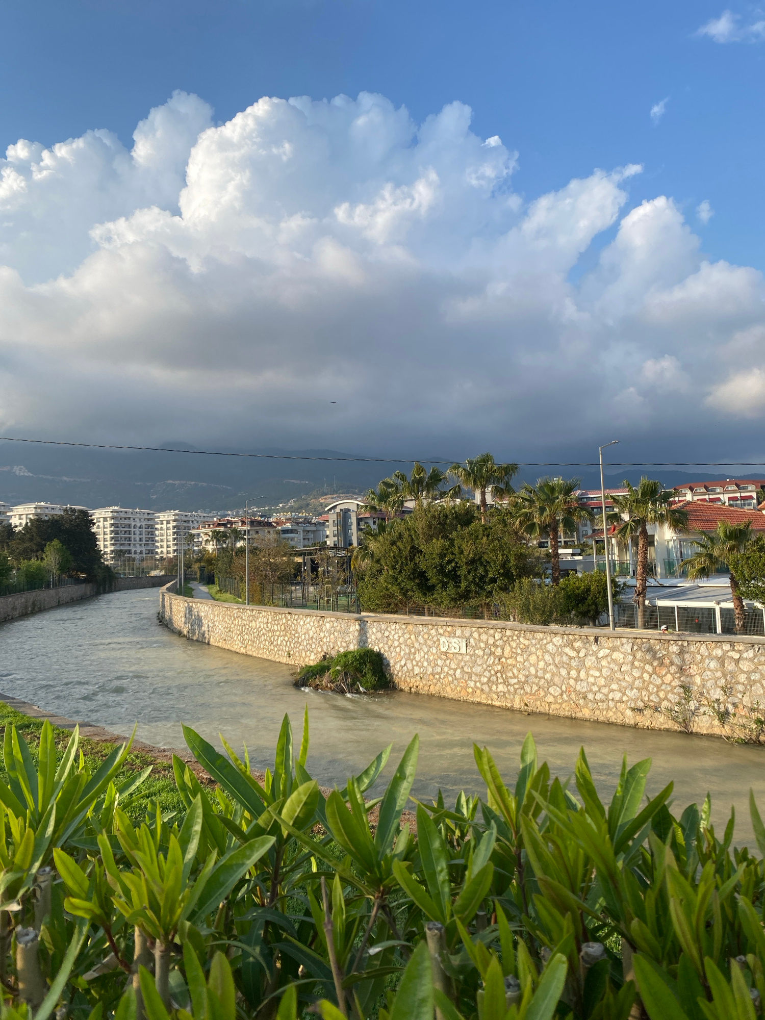 The image presents a view in Alanya, Turkey. A drainage canal or river runs vertically through the frame, bordered by a stone wall. On the right side of the canal is greenery, including foliage. Behin…read more