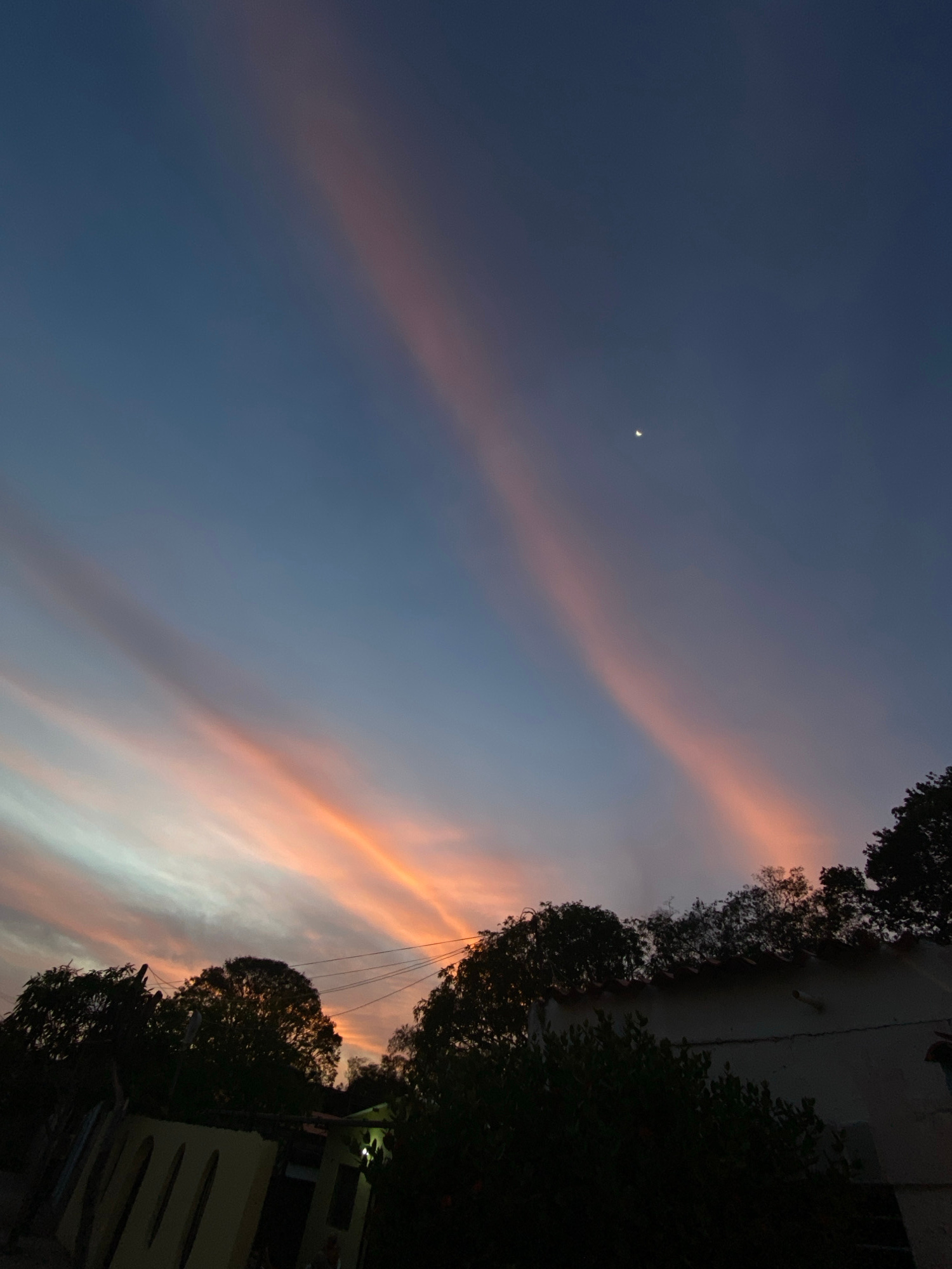 The image captures an evening sky over Juan Griego, Venezuela, at twilight. The sky transitions from a deep indigo-blue at the zenith to lighter blues, purples, and vibrant oranges and pinks near the…read more