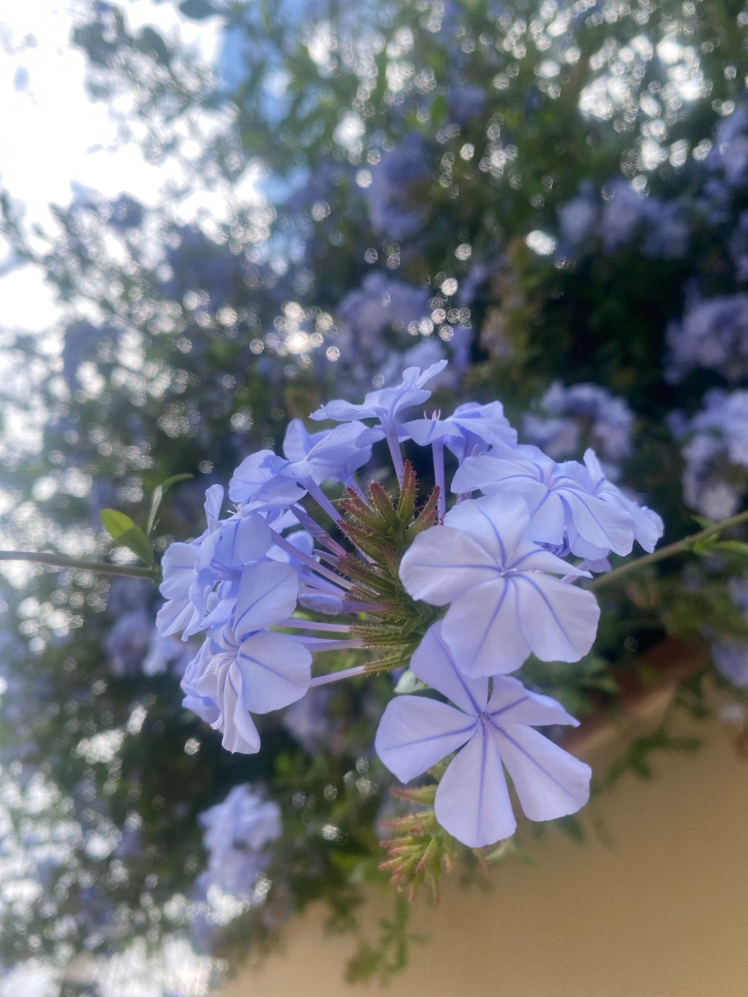 A close-up shot captures a cluster of light blue Plumbago flowers, displaying petals with delicate darker blue lines. The flowers appear to be blooming on a plant growing in an outdoor environment, ev…read more