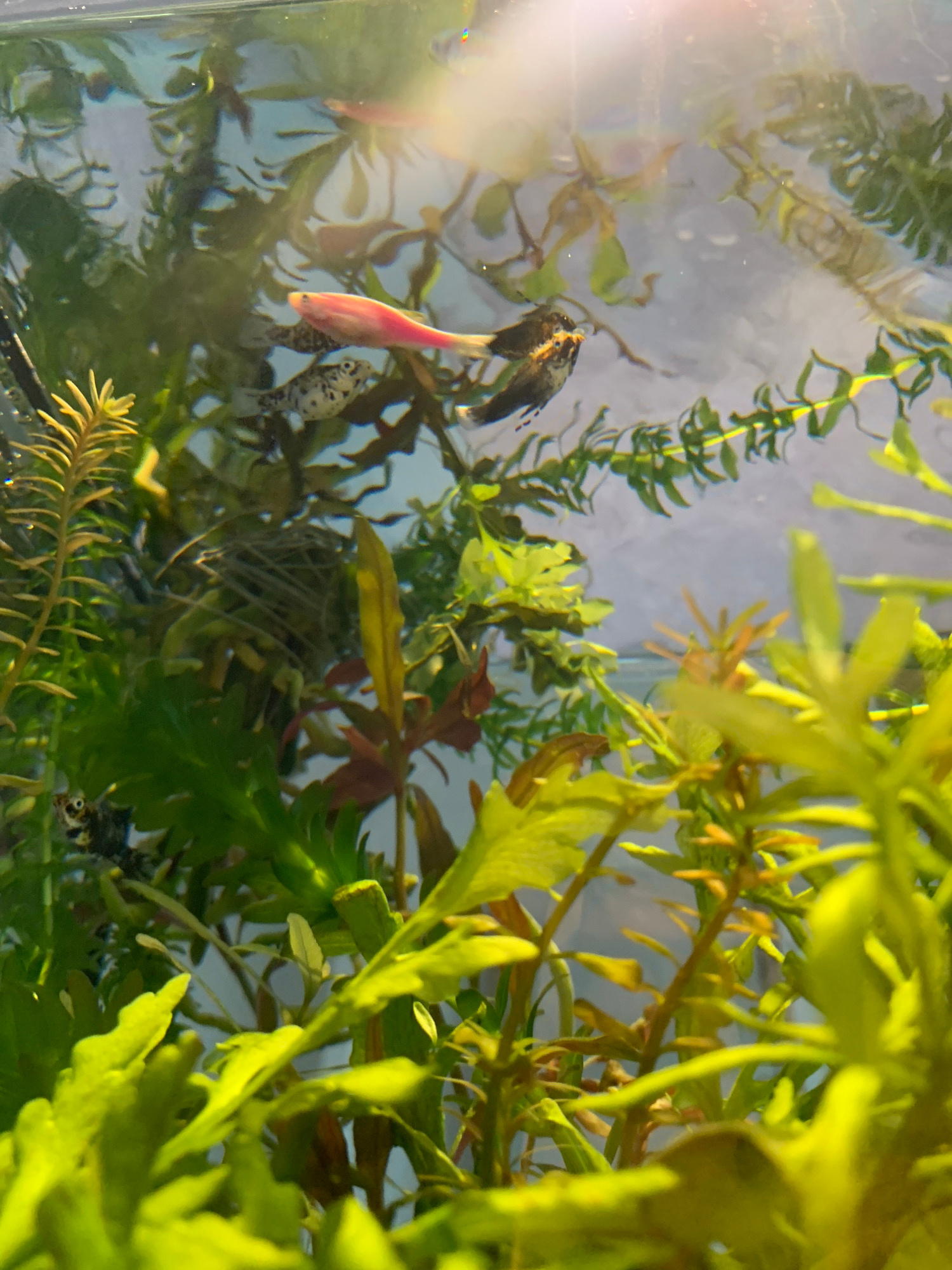 The image appears to be a close-up shot inside a fish tank filled with water and various aquatic plants. Several fish are visible. One fish is predominantly pink. There is a black and white fish with…read more