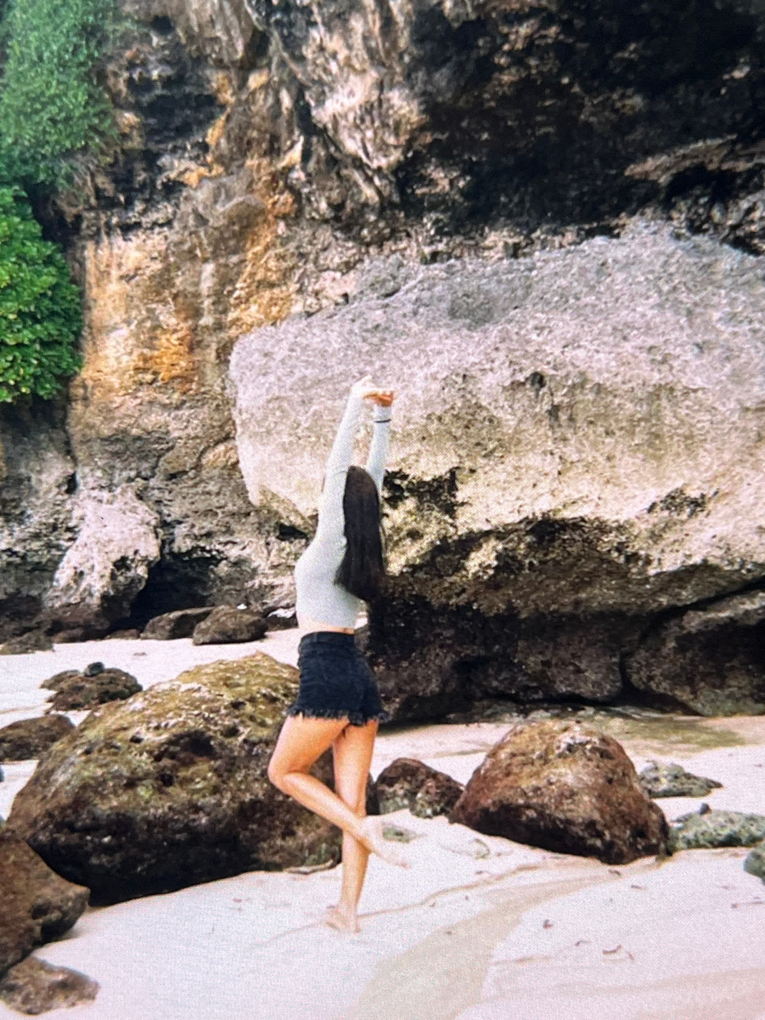 A young woman with long, dark hair is positioned in a prone position atop a large, moss-covered rock formation. She wears a light-colored, long-sleeved shirt and dark denim shorts with frayed edges. H…read more