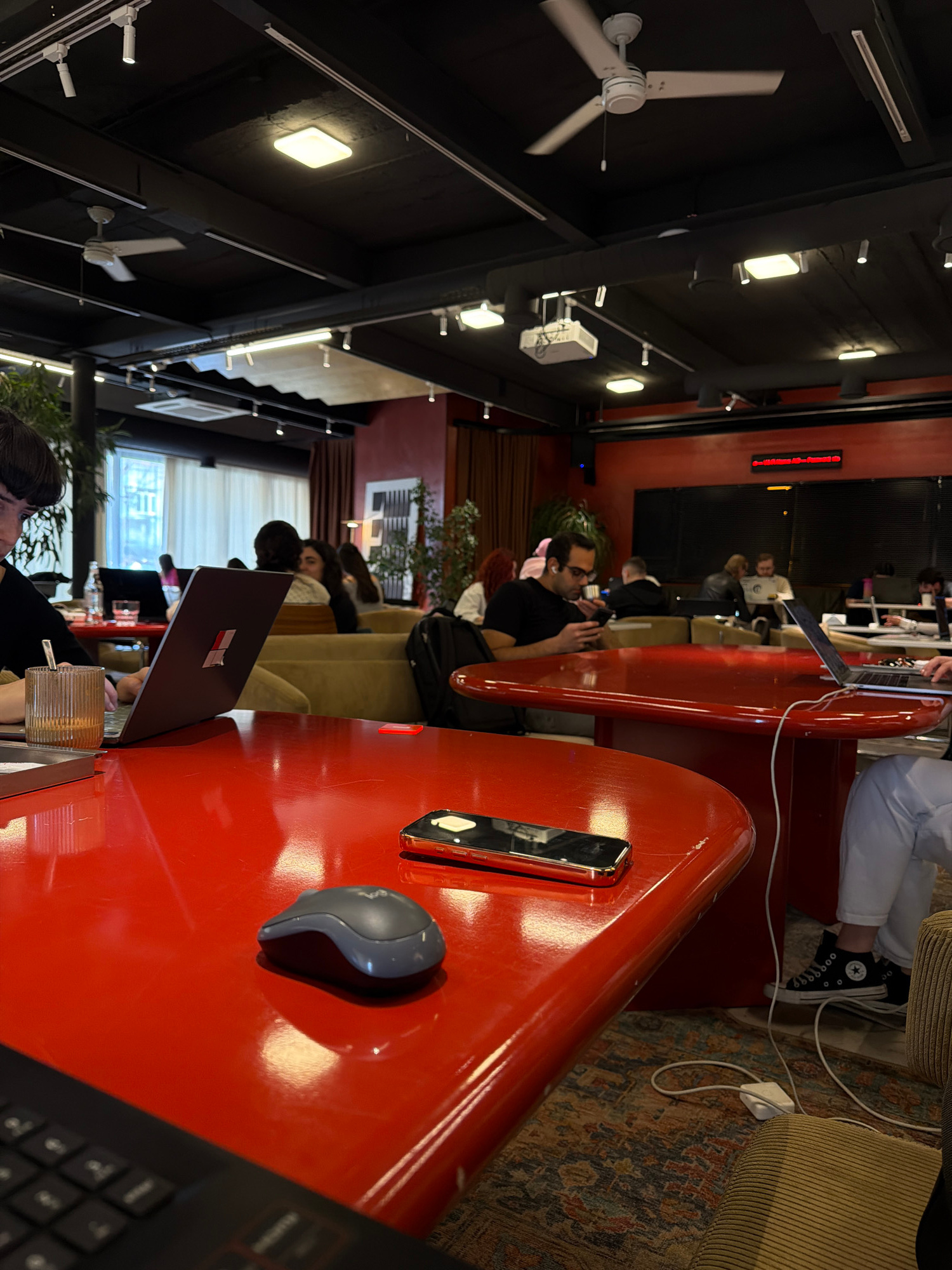 The image shows the interior of a co-working space in Yerevan, Armenia. The space has red tables with people working on laptops and using phones. Several people are seated on couches in the background…read more