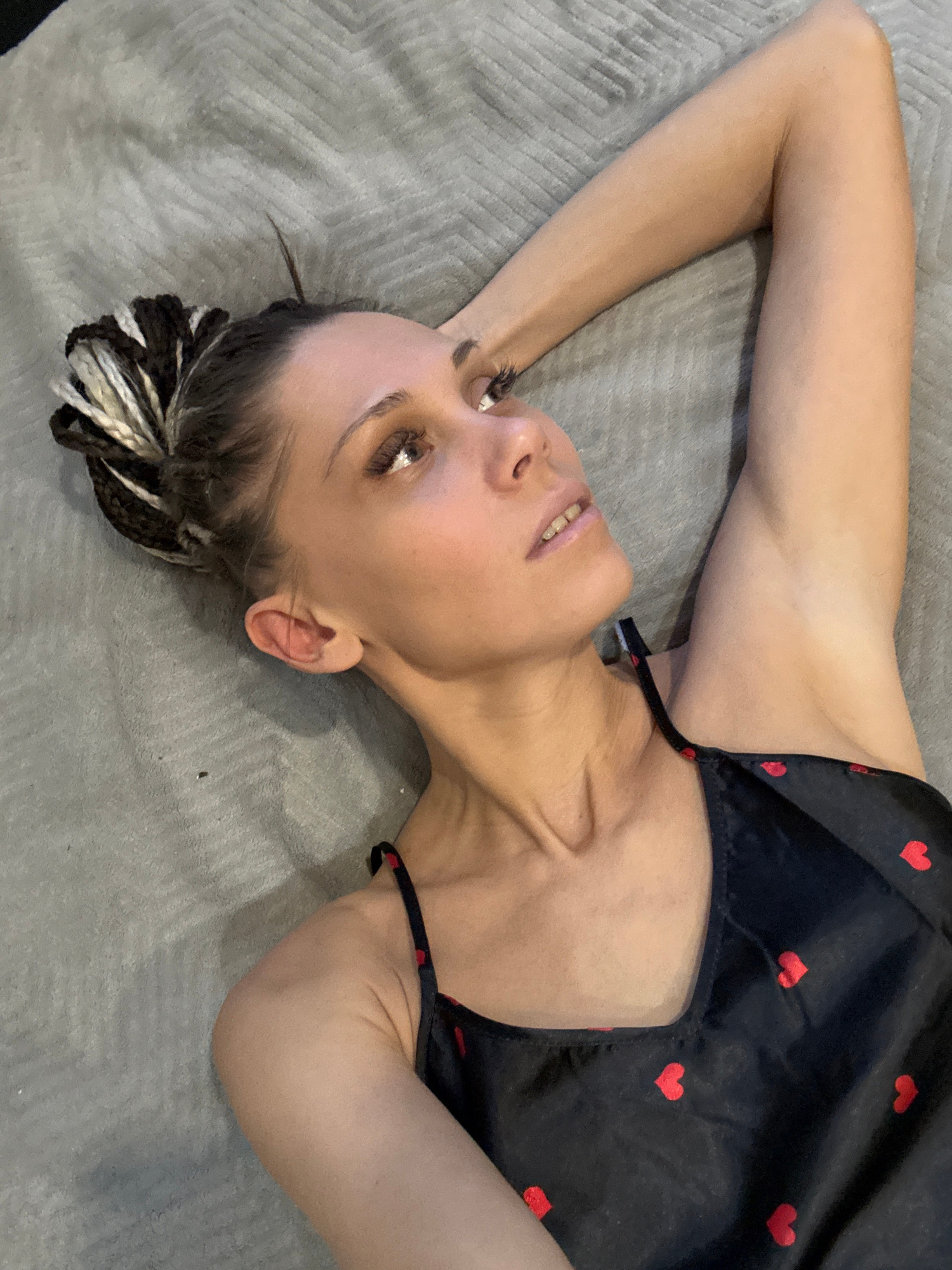 A woman is lying on a gray surface. She is wearing a black top with red hearts. Her arms are above her head, and she is looking up. Her hair is styled in black and white braids. The location is unspec…read more