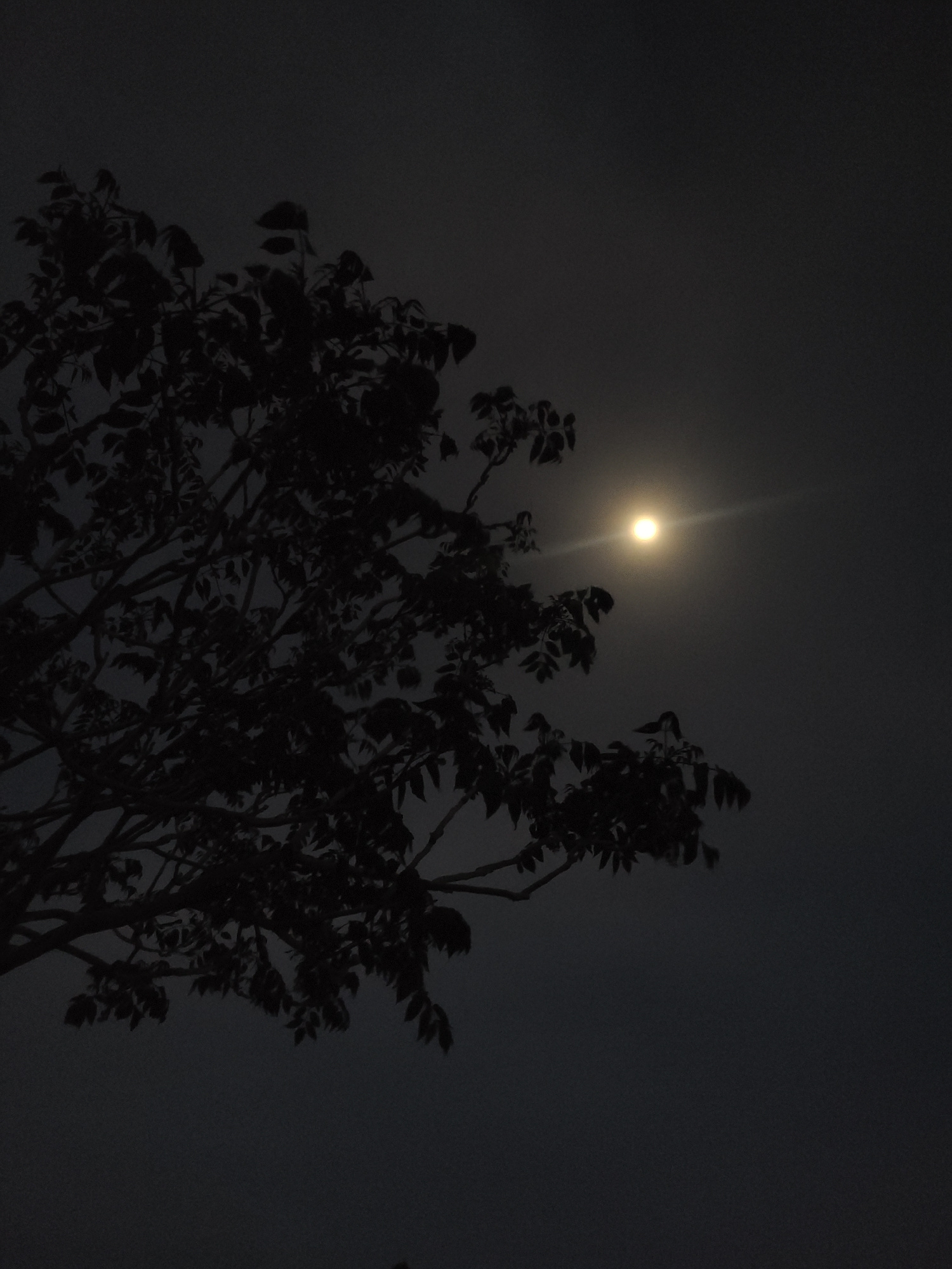 A nighttime scene with a silhouetted tree in the foreground and a bright moon in the background. The branches and leaves of the tree are detailed against the dark sky. A single streak of light extends…read more