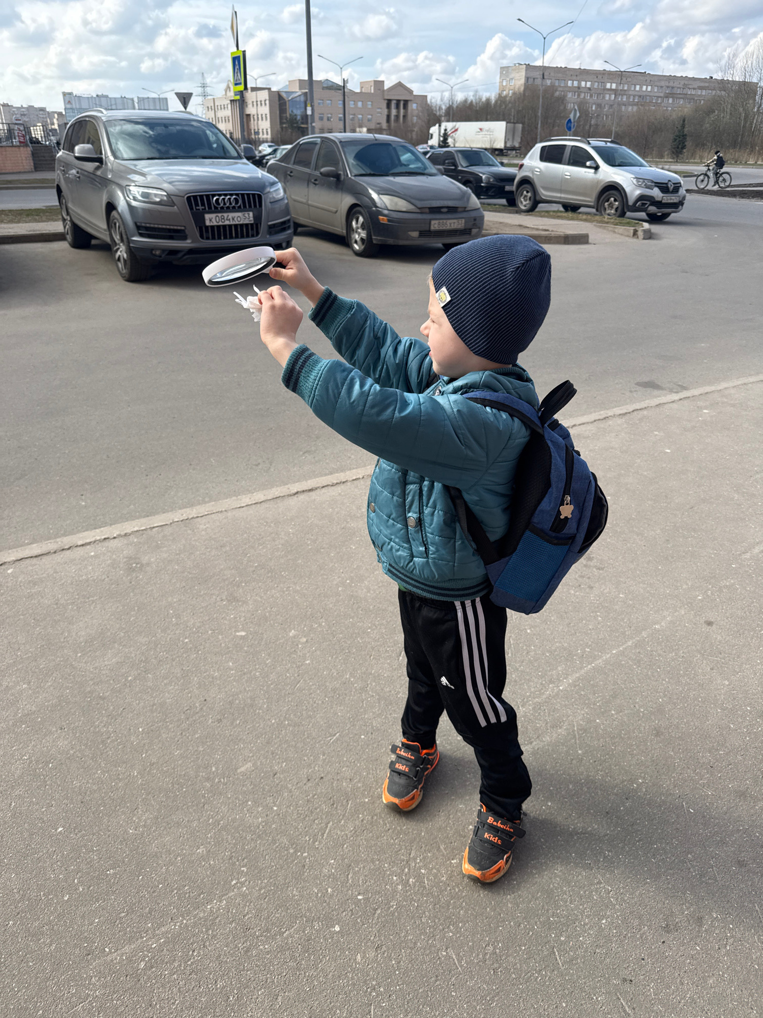A child stands on an asphalt surface in Veliky Novgorod, Russia. The child wears a navy knit cap, a teal quilted jacket, black Adidas-striped pants, and black and orange sneakers, with a blue backpack…read more