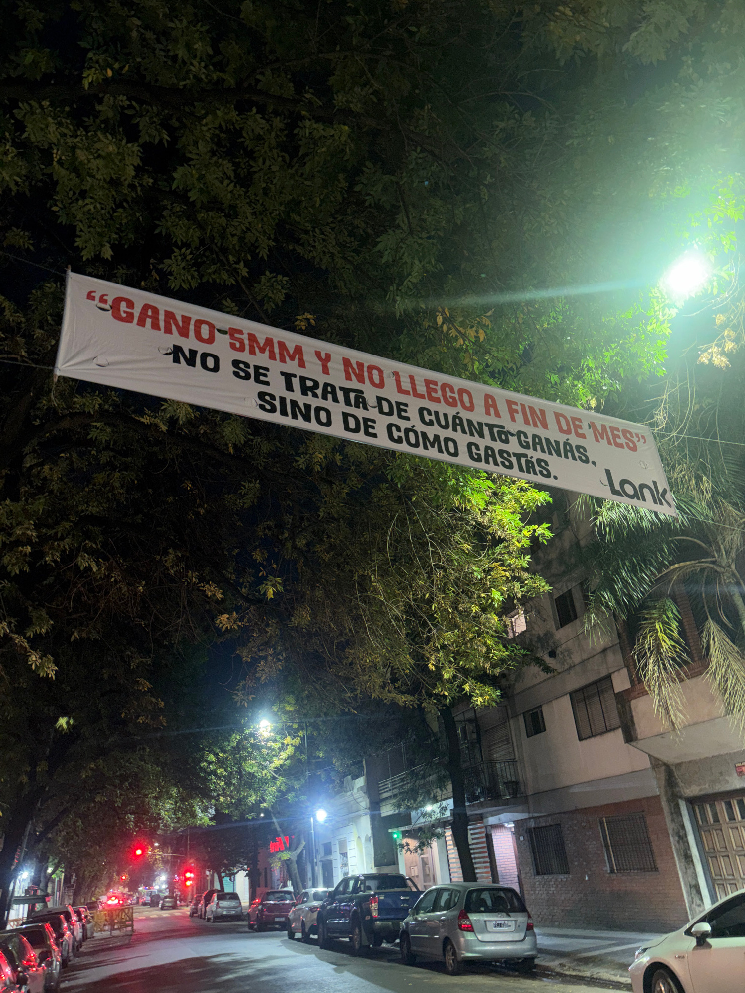 The image is a street scene at night, likely in Buenos Aires, Argentina, suggested by the Spanish text on a banner. The banner reads "GANO-5MM Y NO LLEGO A FIN DE MES" "NO SE TRATA DE CUÁNTO GANÁS. SI…read more