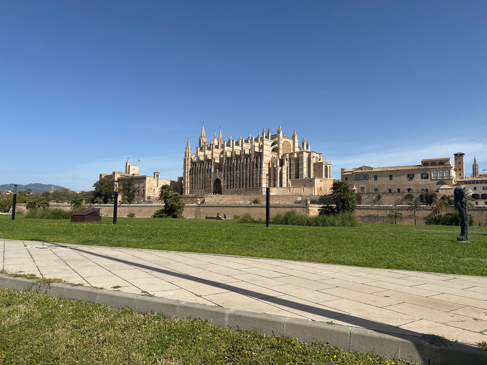 The image shows the Cathedral of Santa Maria of Palma, also known as La Seu, in Palma de Mallorca, Spain. The large Gothic cathedral dominates the background of the image. To the left of the cathedral…read more