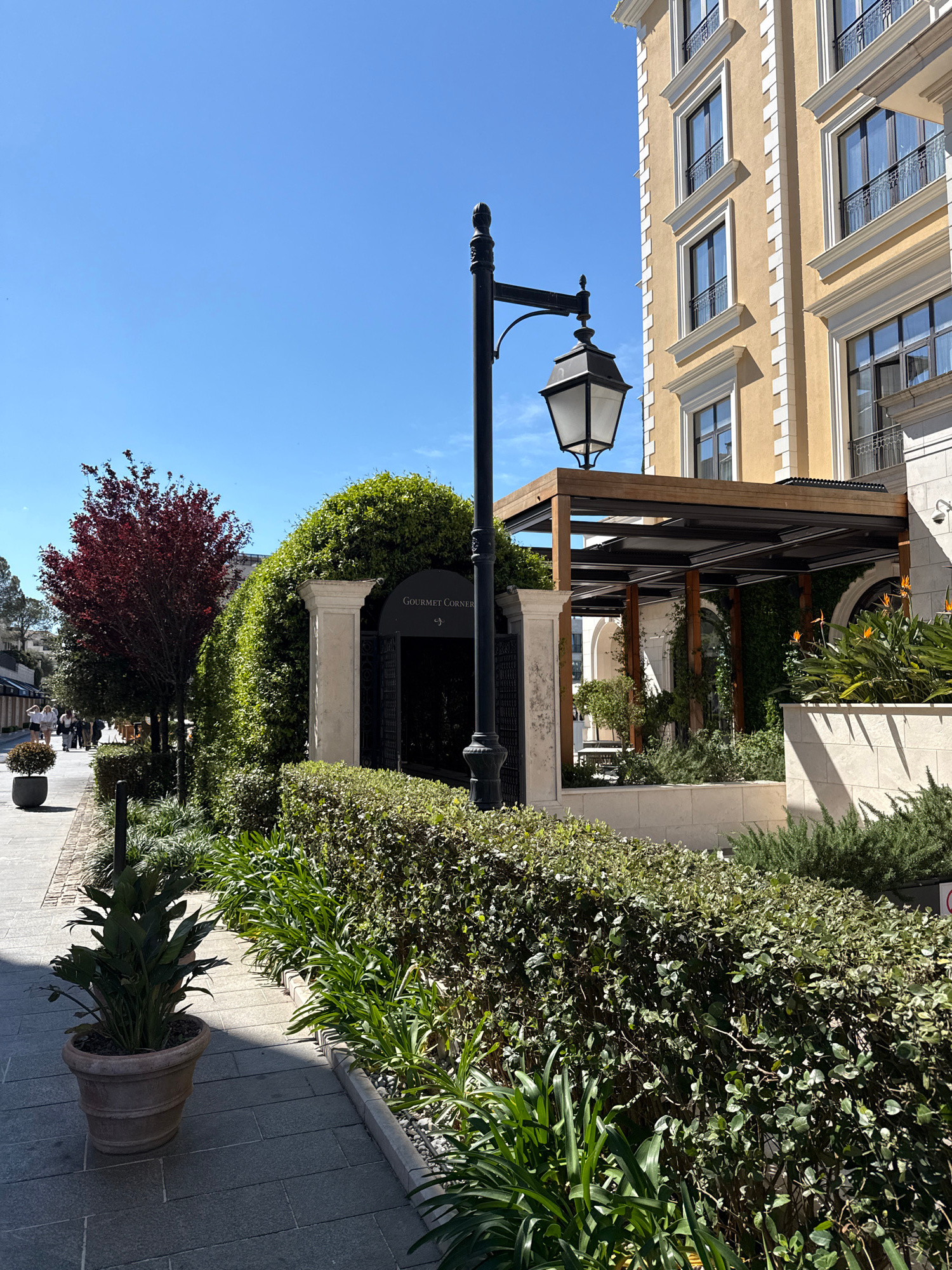 The image depicts an outdoor scene in Tivat, Montenegro. A sidewalk made of gray pavers is visible, leading towards an area with people walking. A large potted plant is present on the right side of th…read more
