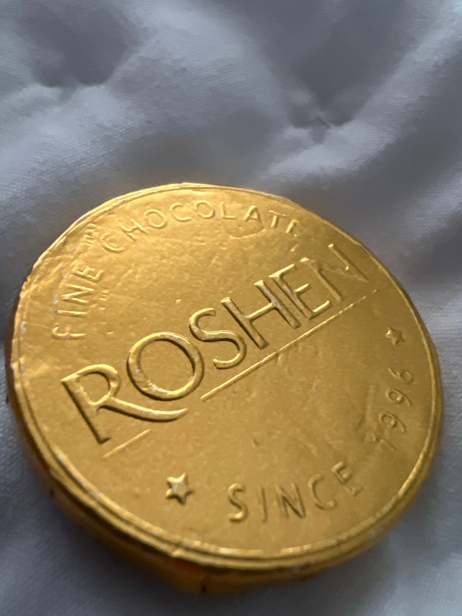 A gold foil-wrapped chocolate coin with "ROSHEN FINE CHOCOLATE" and "SINCE 1996" inscribed on it rests on a white, textured surface. The object is not readily identifiable as being located in Budva, M…read more