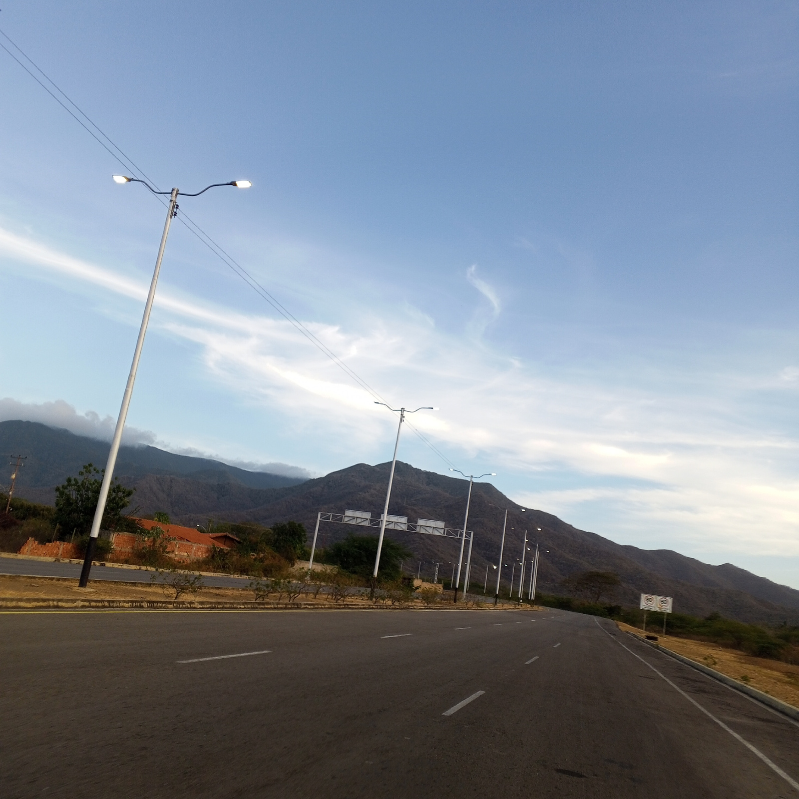 The image depicts a road in Santa Ana, Venezuela, with mountains in the background. The road is asphalt and has white lane markings. Streetlights line the side of the road. The sky is blue with scatte…read more