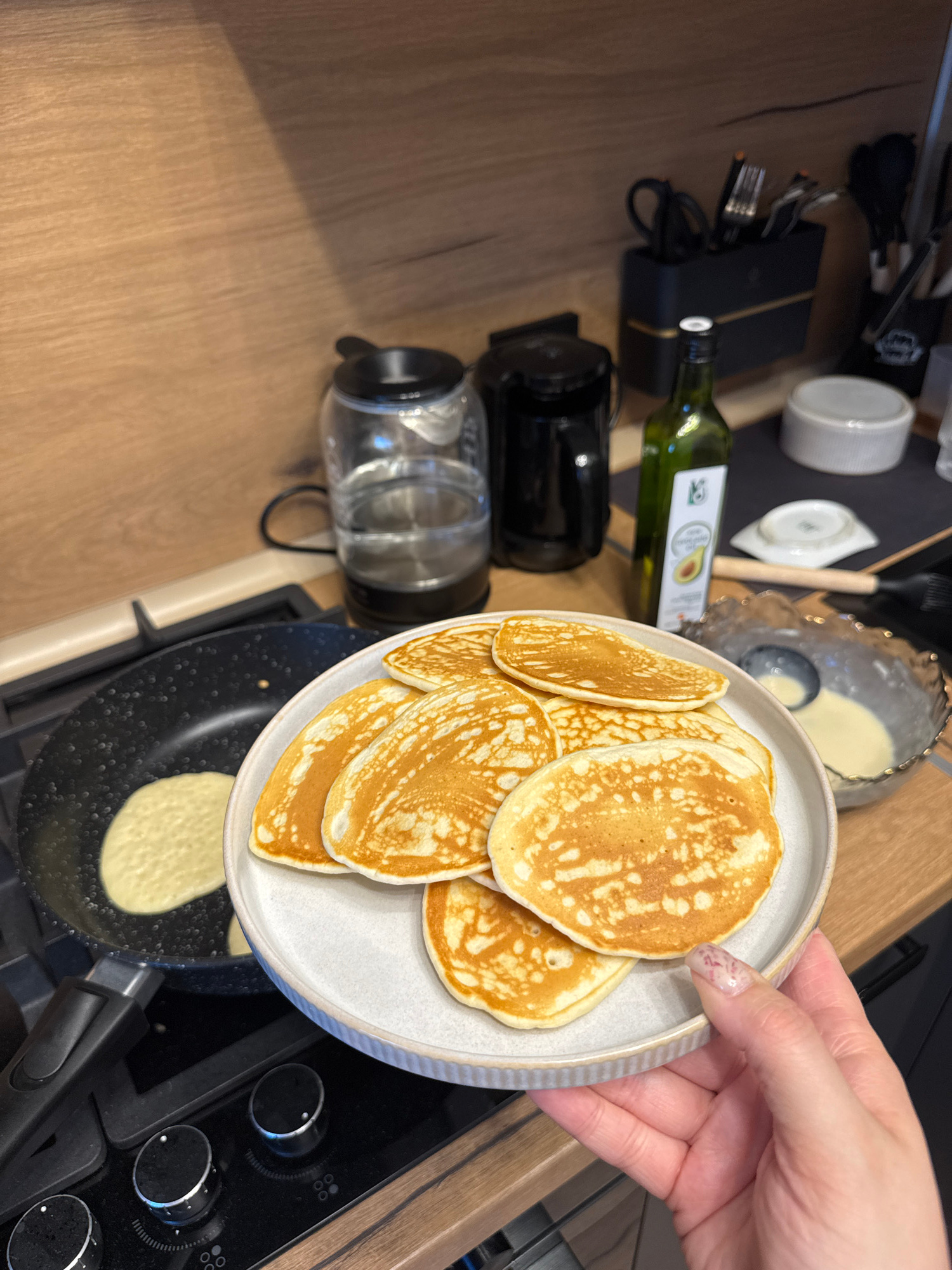 A close-up, high-angle shot depicts a kitchen setting, presumably indoors. A light-skinned hand holds a gray plate piled with golden-brown pancakes. Below the plate, a frying pan sits on a black stove…read more