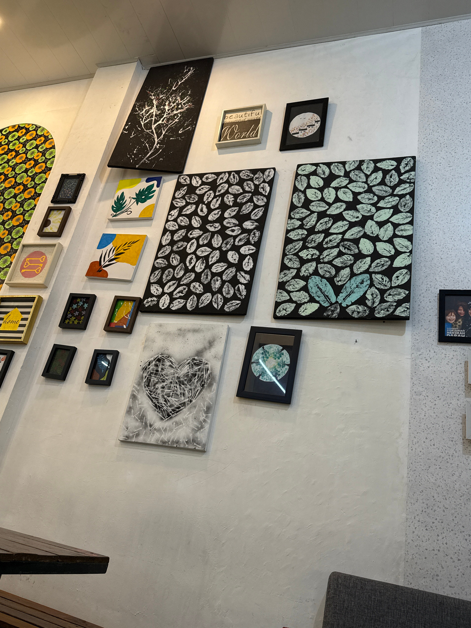 The image shows a wall decorated with a collection of framed artworks of various sizes and styles. The artworks include paintings and prints featuring abstract designs, botanical motifs, and geometric…read more