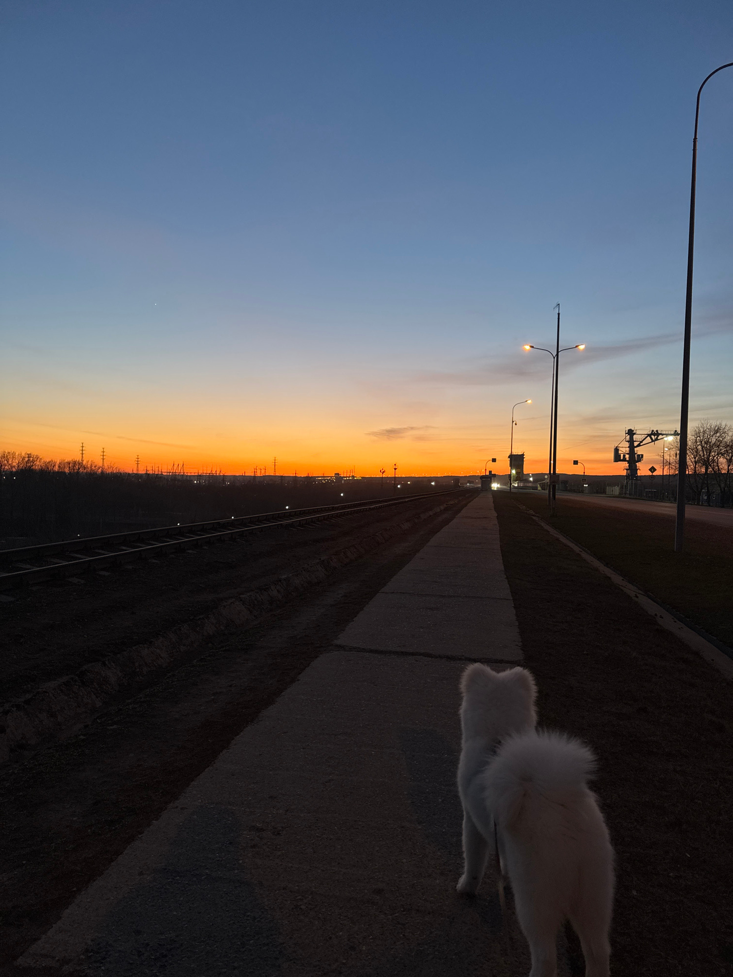 This image, taken in Chaikovsky, Russia, captures a twilight scene featuring a white, fluffy dog, possibly a Samoyed, walking along a concrete path adjacent to railroad tracks. The sky displays a beau…read more