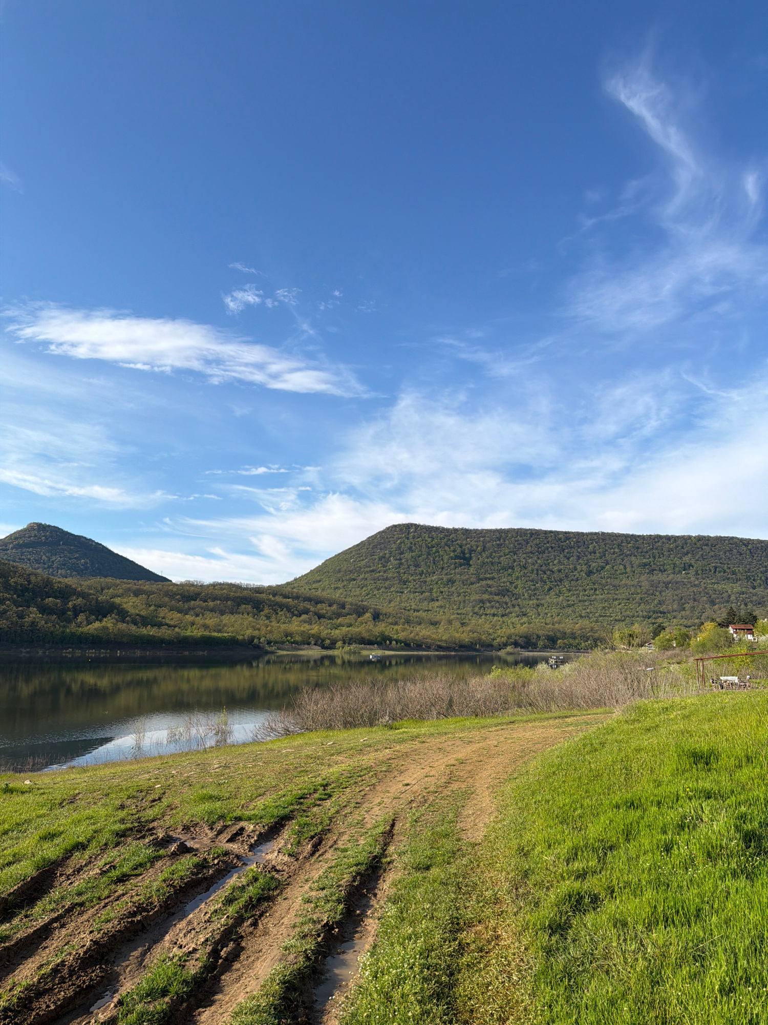 The image presents a serene natural landscape, likely in the Asparuhovo area of Bulgaria, under a bright blue sky adorned with scattered, wispy white clouds. A calm body of water, possibly a river or…read more