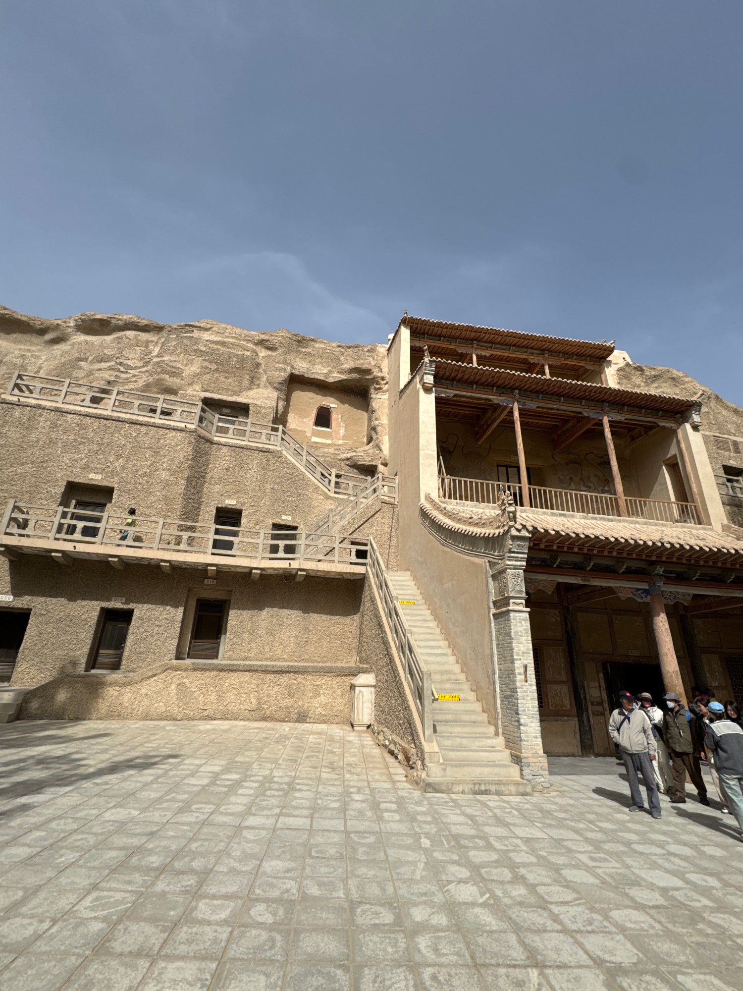 The image shows a view of the Mogao Caves, located in Dunhuang City, China. The caves are built into a cliff face, with multiple levels and structures attached to the exterior. There are wooden walkwa…read more