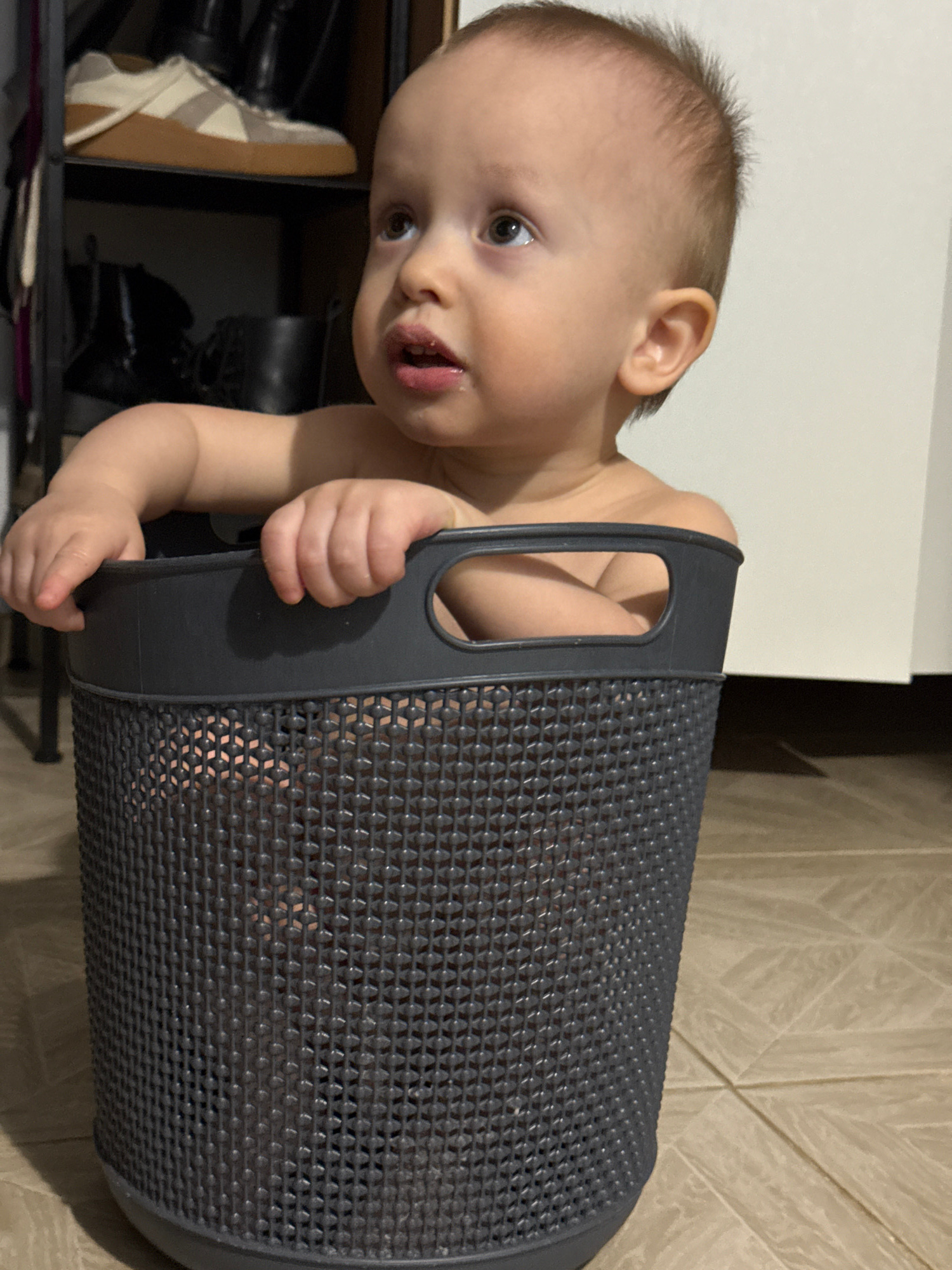 A toddler is partially inside a gray plastic laundry basket. The child is fair-skinned with brown hair. The child's face is tilted towards the camera. The child has brown eyes. The surrounding environ…read more
