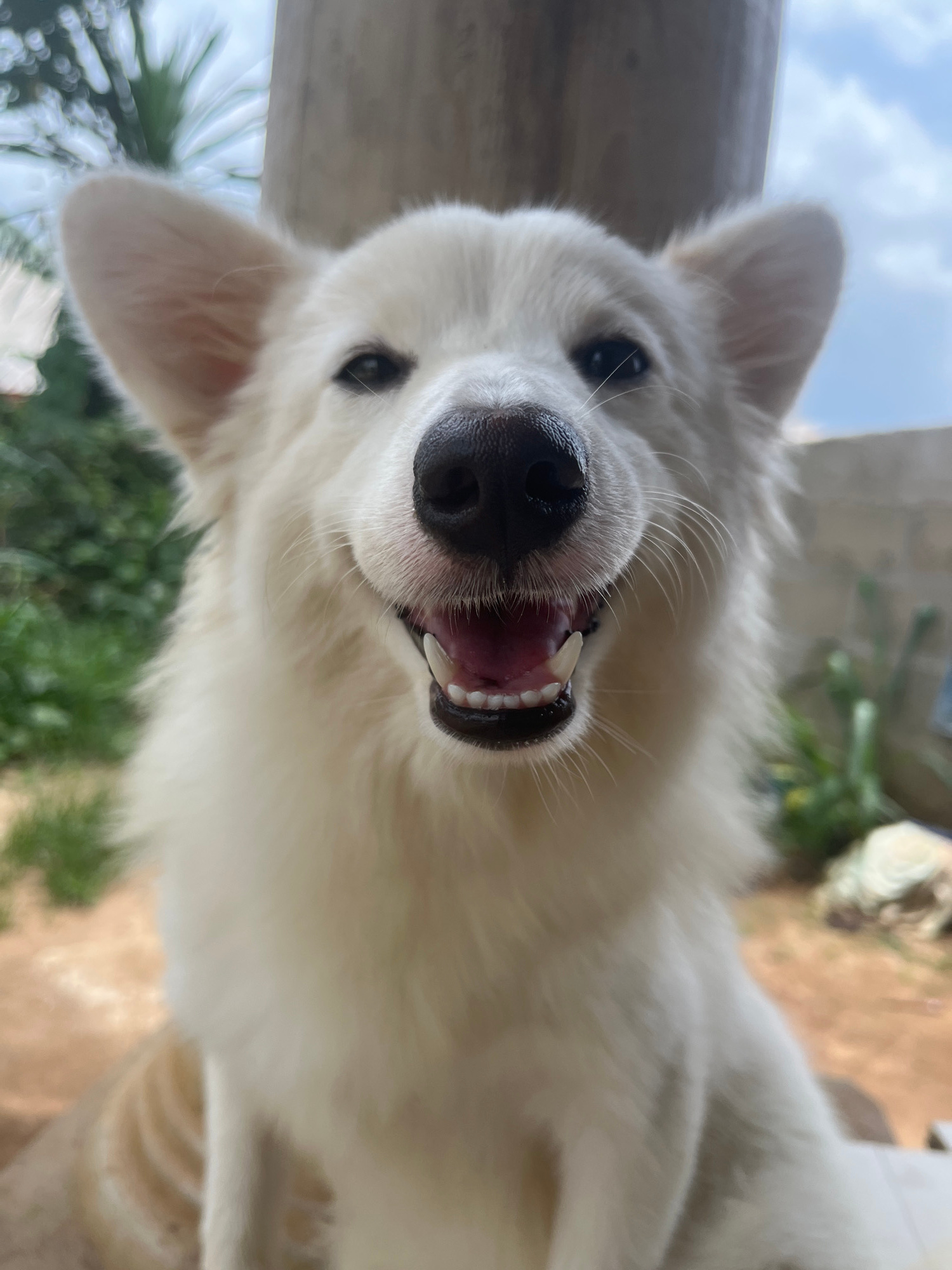 An extreme close-up shot of a white dog with a black nose. The dog has black eyes and is showing its teeth in what appears to be a smile. The background includes green foliage and a hint of the sky. T…read more