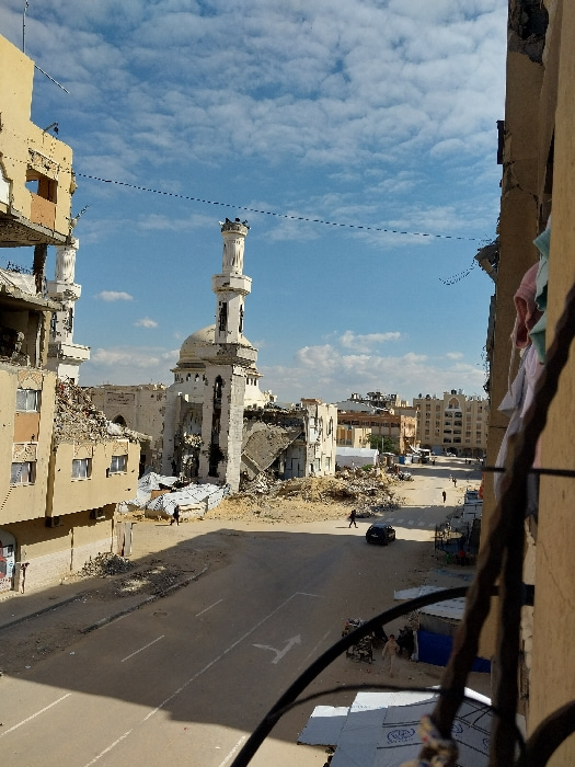 The image depicts a severely damaged urban environment in Khan Yunis, Palestinian Territory, viewed from an elevated vantage point. A large, light-colored mosque with a prominent, relatively intact mi…read more