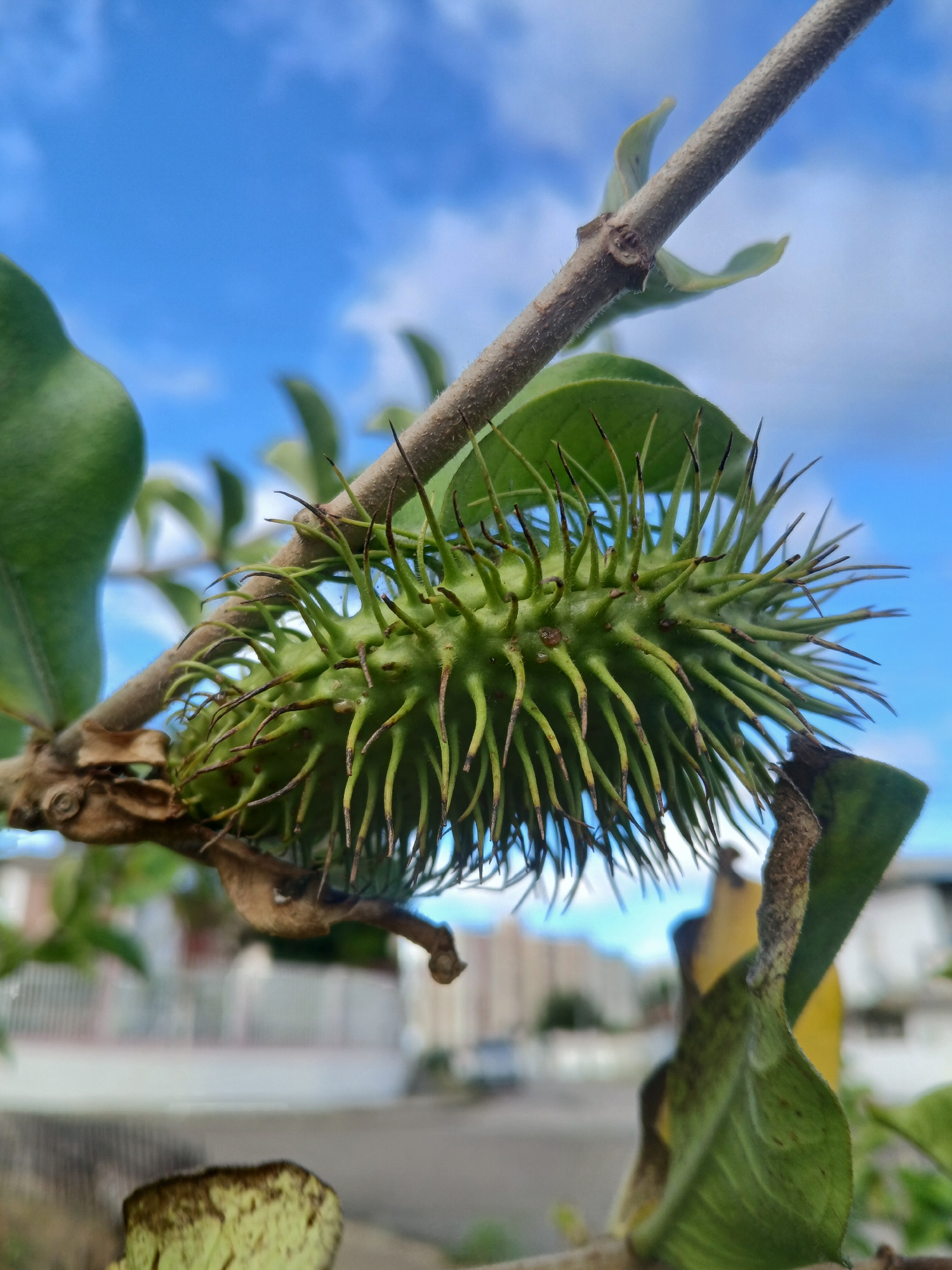 A close-up photograph captures a single, green, oblong fruit or seed pod densely covered with sharp, brownish-green spines, positioned centrally and attached to a brown, textured woody branch. Several…read more