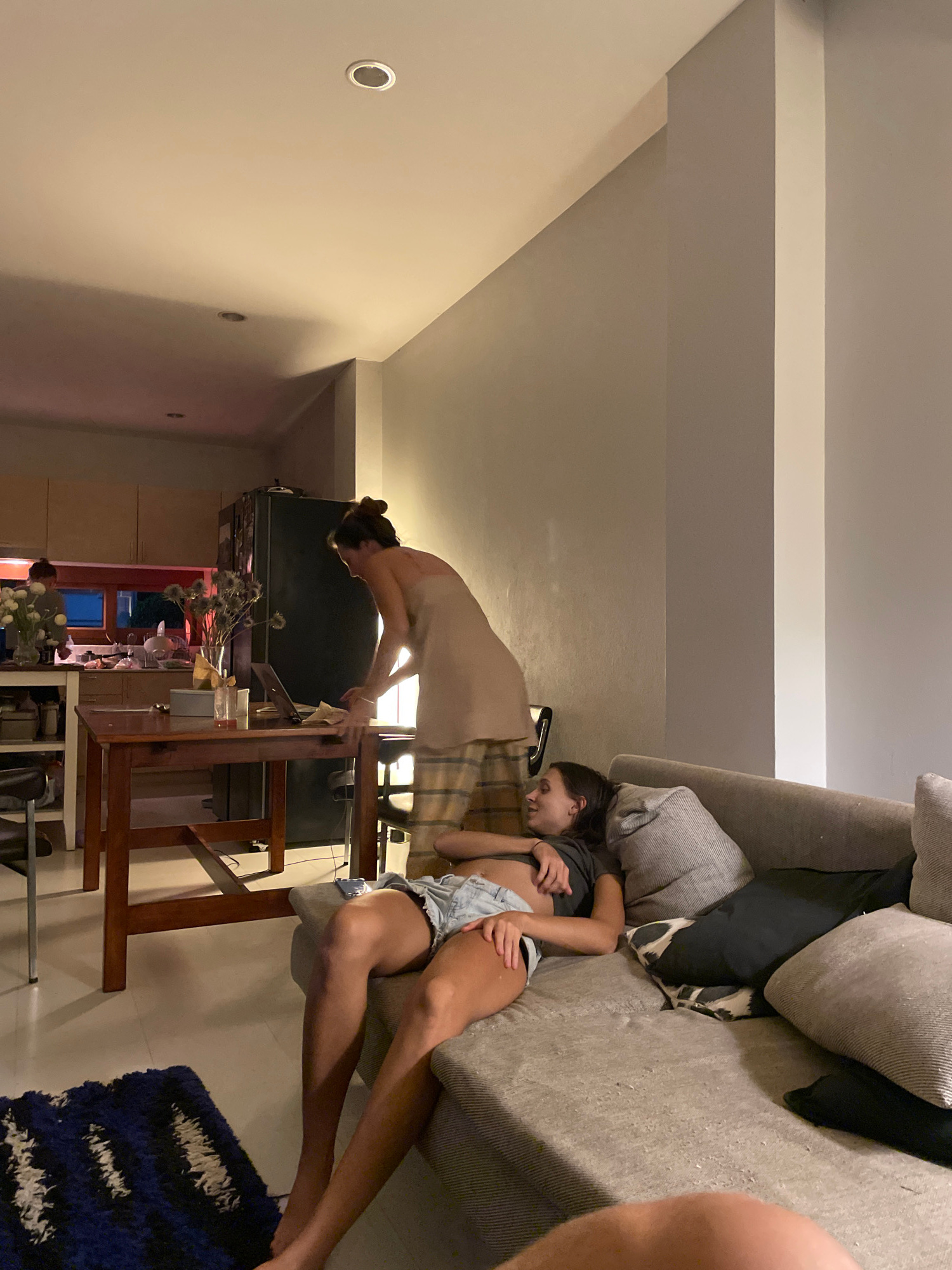The image captures an indoor scene, likely a living or dining area, with two young women present. The room is dimly lit, suggesting evening or nighttime. On the right side of the frame, a woman withβ¦read more