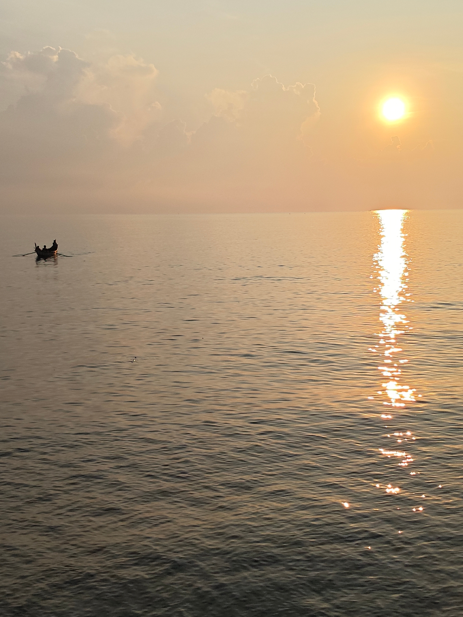 The image depicts a serene coastal scene, likely taken in Lhokseumawe, Indonesia. A small boat with two or three individuals aboard is visible in the distance to the left. They appear to be rowing or…read more