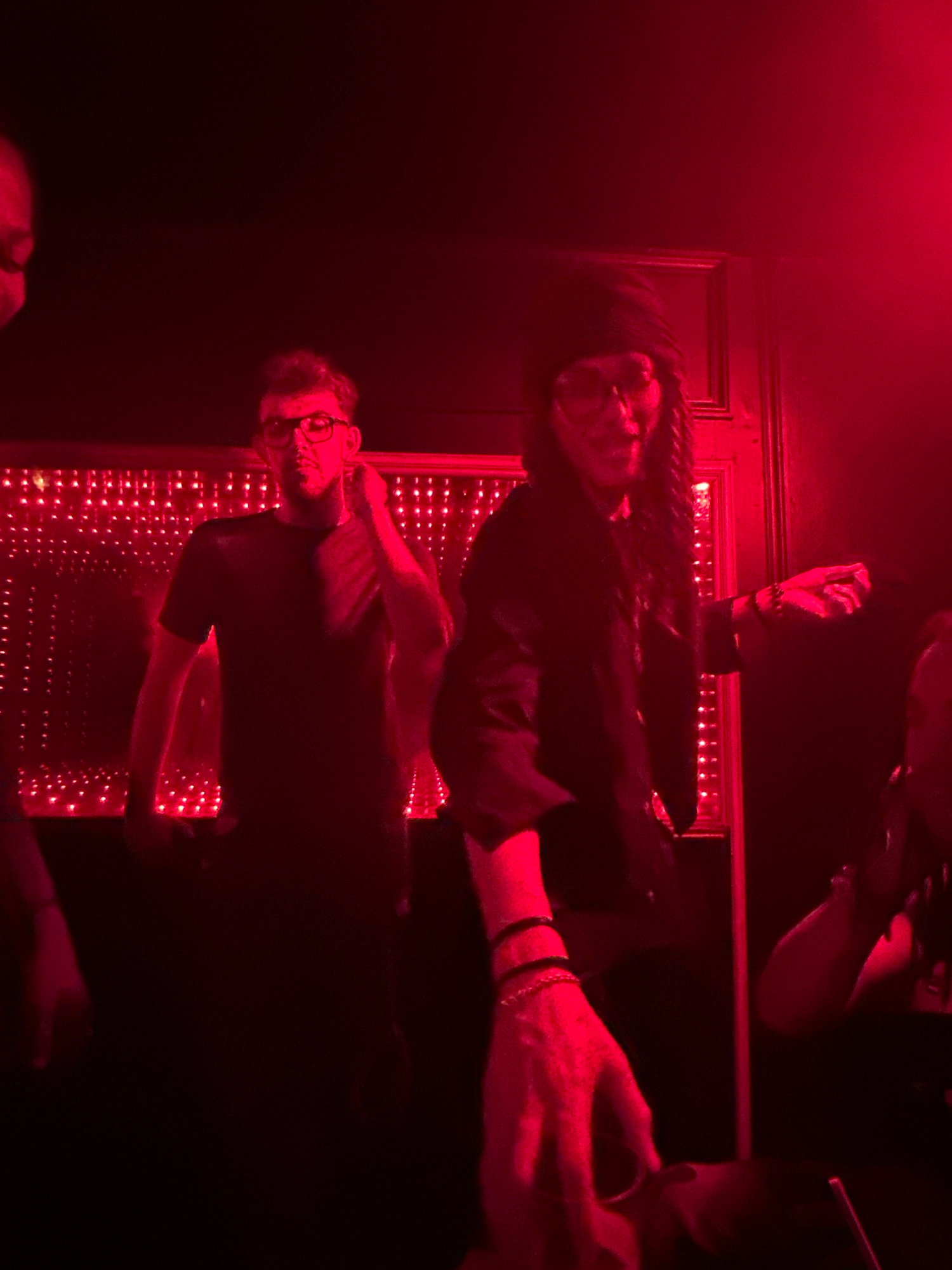 A red-lit interior photograph appears to be taken in a nightclub or bar. At least four people are present, with one wearing glasses and another wearing a hat. They appear to be near a wall illuminated…read more